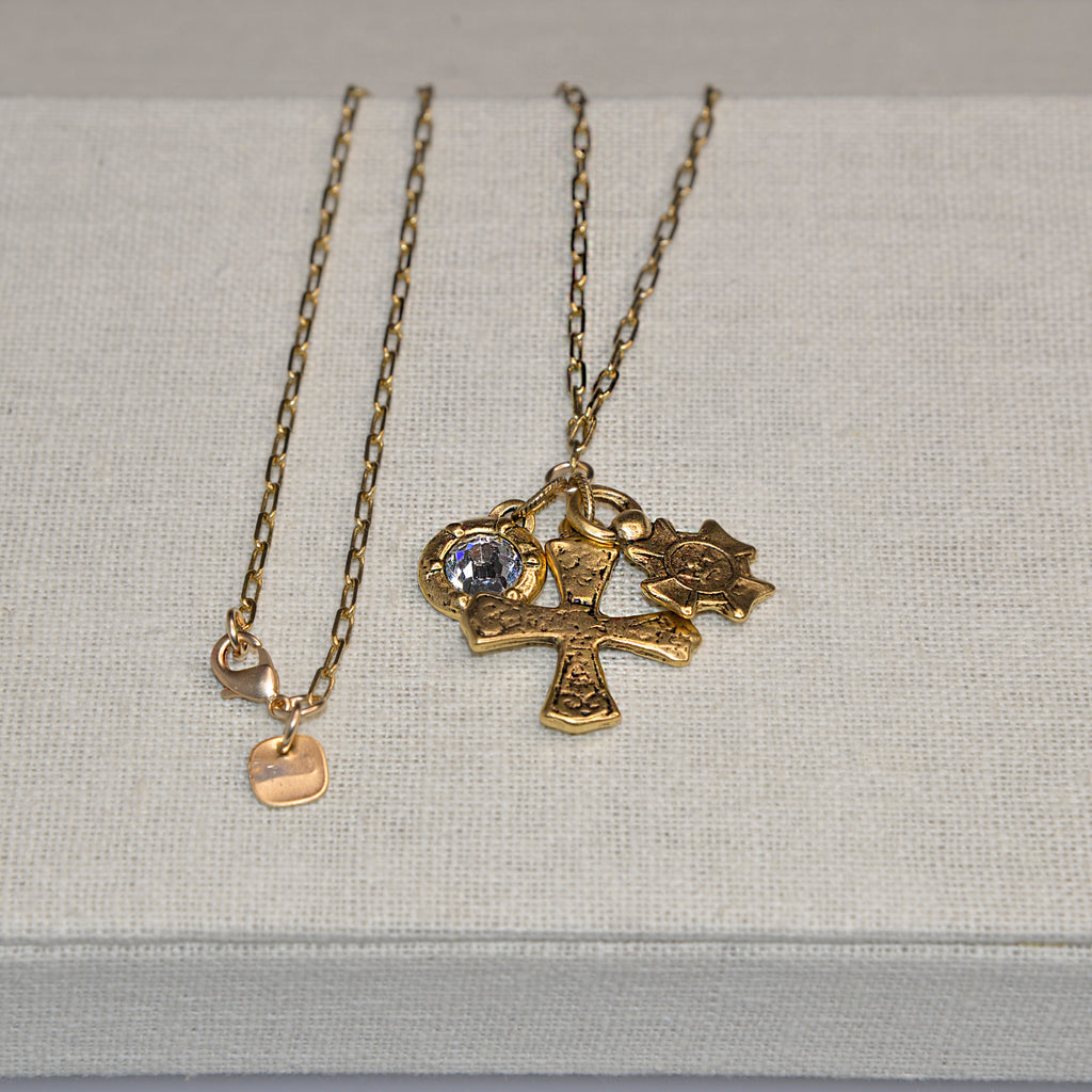 12k Gold Plate Ancient Maltese Cross and French Charm Pendant Necklace