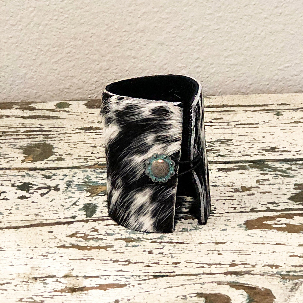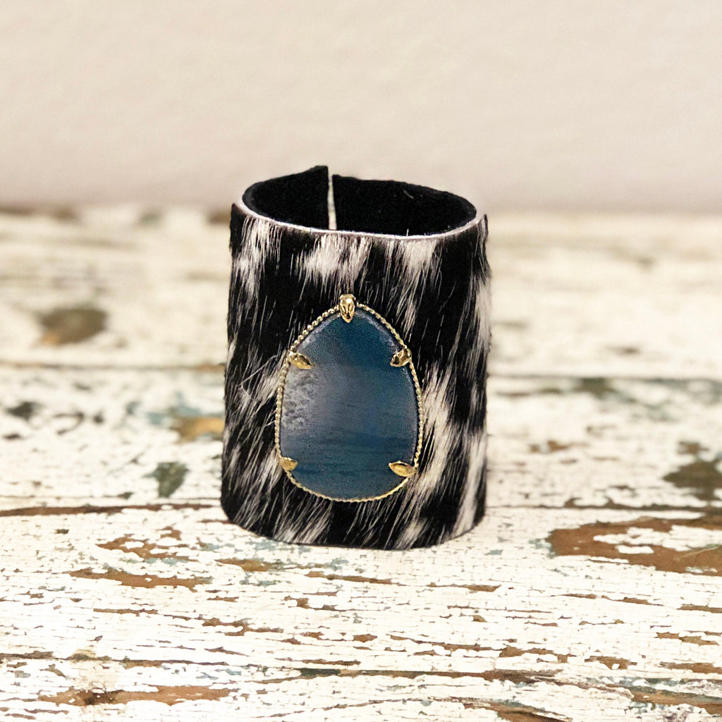 Brazilian black and white fur cowhide cuff lined at the inside wrist with black suede leather for comfort. The cuff is adorned with a blue Agate slice in gold tone. This cuff is adjustable with a copper patina flower closure and elastic loop. The look is edgy western, chic. Makes a great holiday or anytime gift!