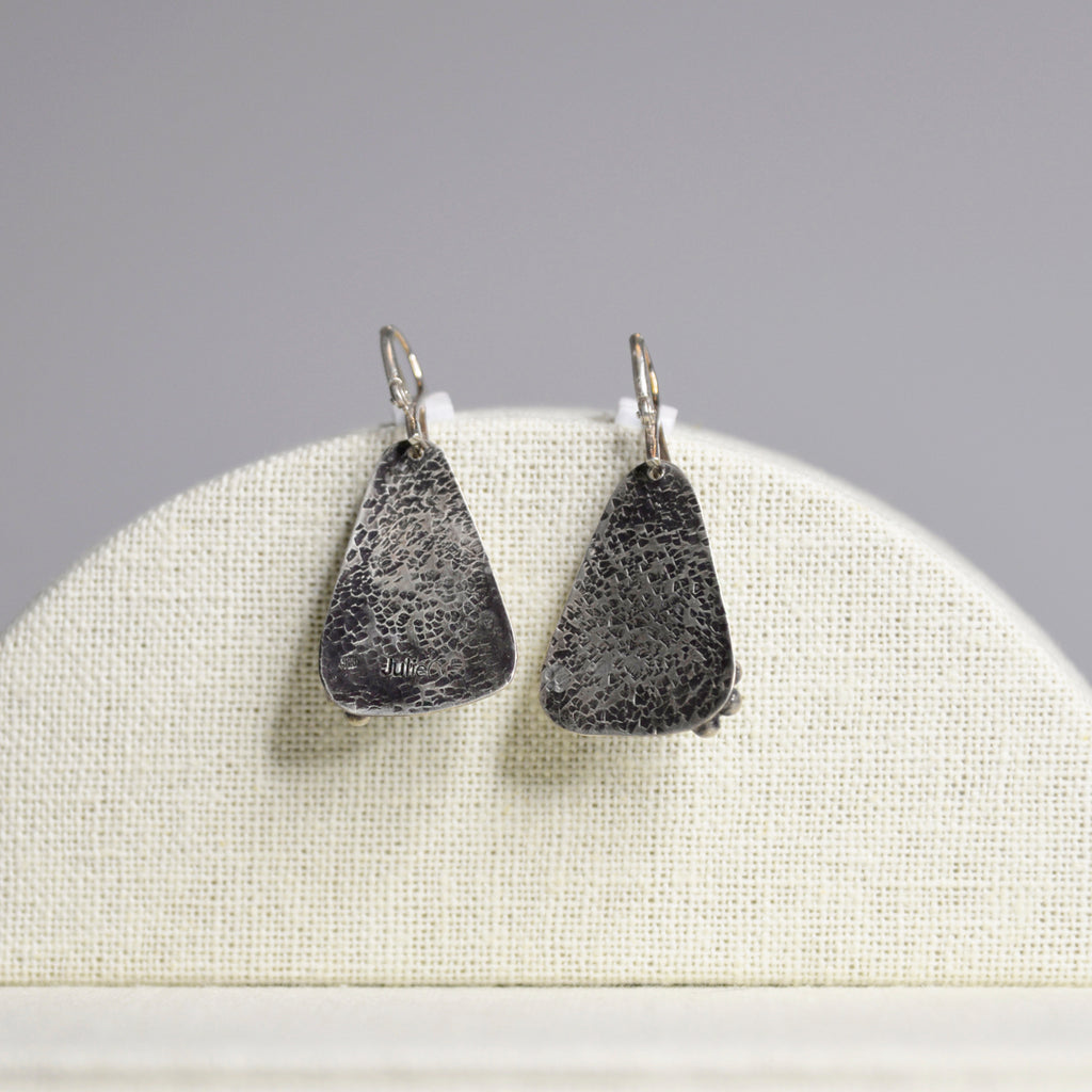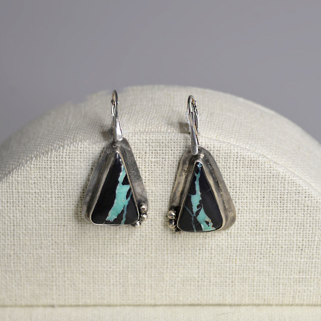 These beautiful matched pair of Black Buffalo ribbon turquoise are set in a silver bezel setting accented with 3 silver beads. Each stone is approximately 1.5 ct. and were cut by Kenneth Otteson.