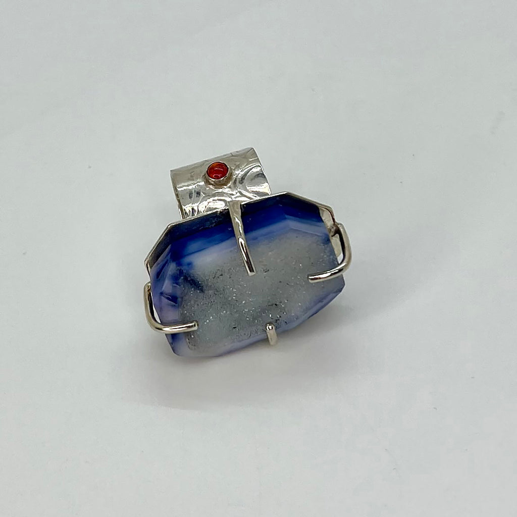 This large Sterling Silver and Blue Drusy Agate and Fire Opal statement ring will look amazing with anything you wear. It is also an eye catcher to be sure. The sterling silver band is textured, wide but thin and comfortable to wear. The center stone is accented by a single fire opal on either side attached to the band.
