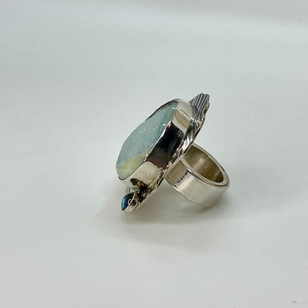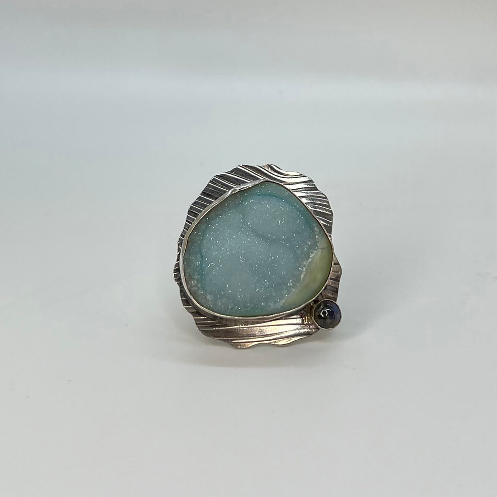 Large statement ring. Blue Lace Drusy Agate and sterling silver looks stunning on your finger. It's like wear an ocean scene on your finger. The textured sterling silver background makes this stunning agate pop. The 5mm rainbow moonstone accent stone only adds depth to the overall setting.