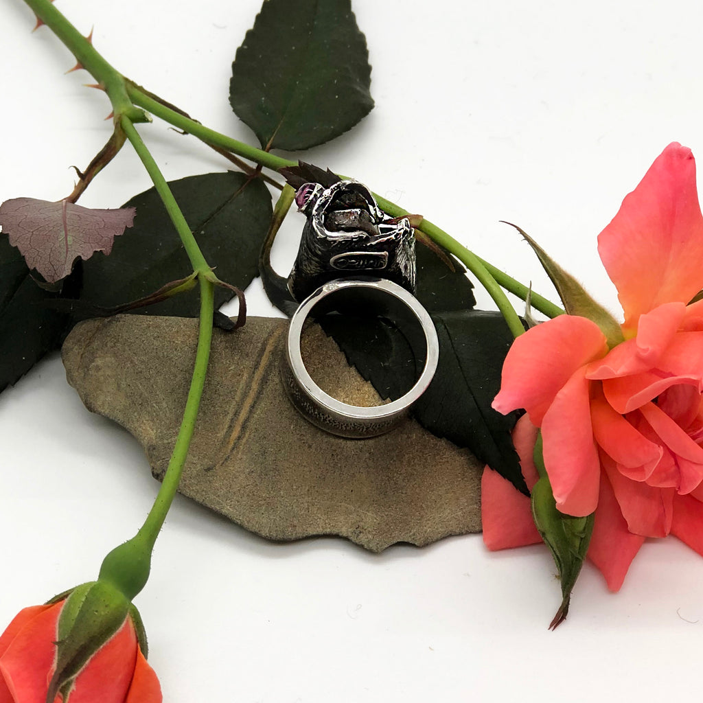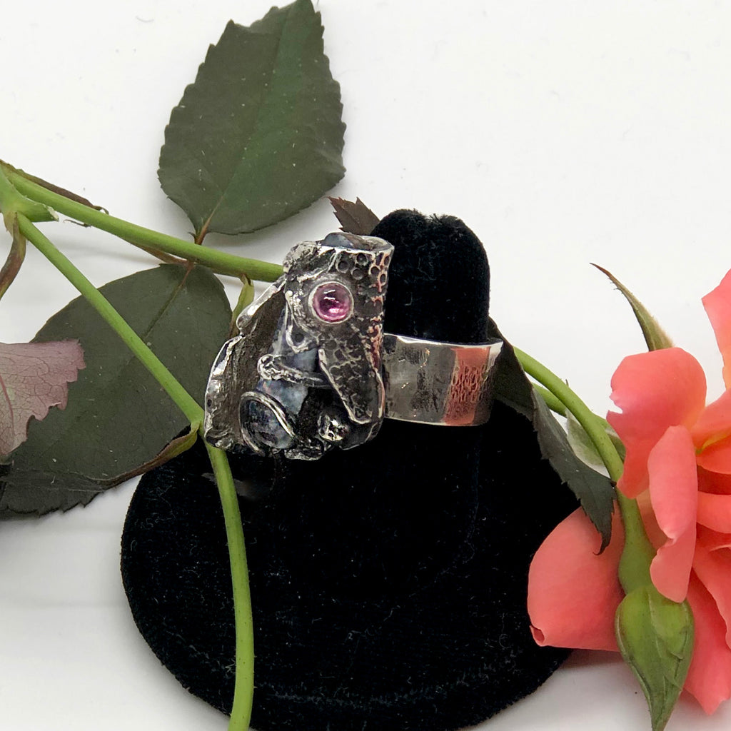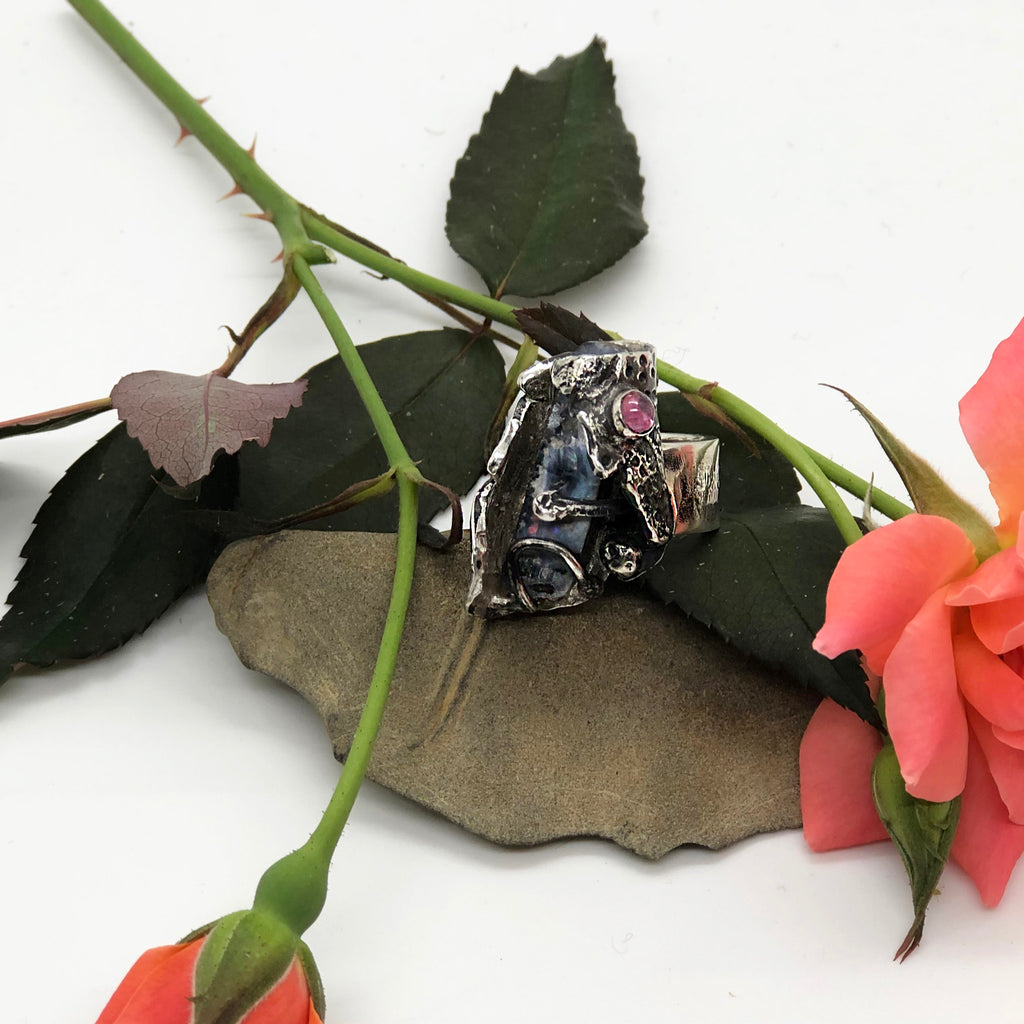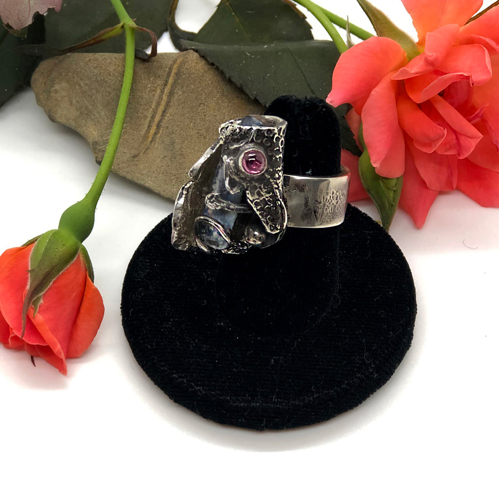 This beautiful and artful ring reminds me of an seen from under the sea. The lines are free-flowing around a bright blue, Boulder Opal and accented by a lovely 4mm, round Amethyst cabochon. The prongs snake around the opal like seaweed flowing in the ocean current. The band is .25" wide and a size 7.