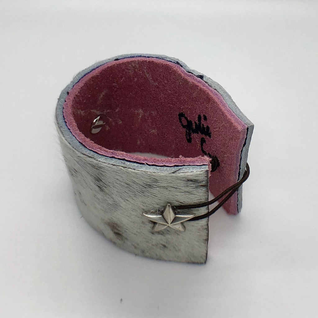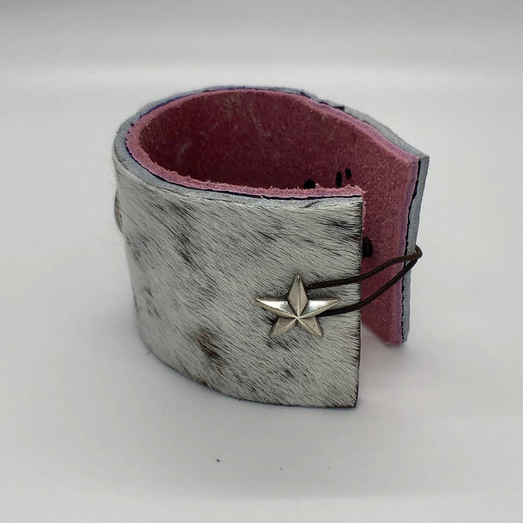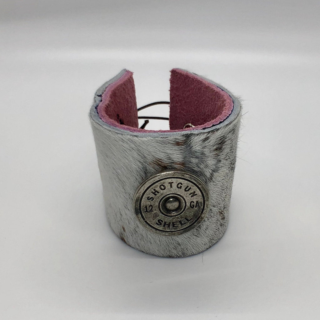 Brazilian white and brown fur cowhide cuff bracelet adorned with a 12g shotgun shell. This bracelet is lined with a soft, pink leather for comfort and stability. I created this line to support the moms of my daughter's high school clay shooting team, just a little something for all they do to support their kids. This cuff has a steel star concho closure which is adjustable with an elastic loop.