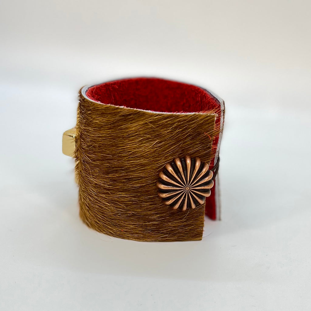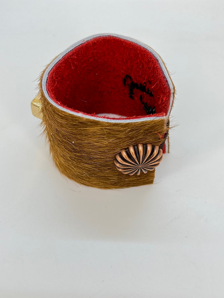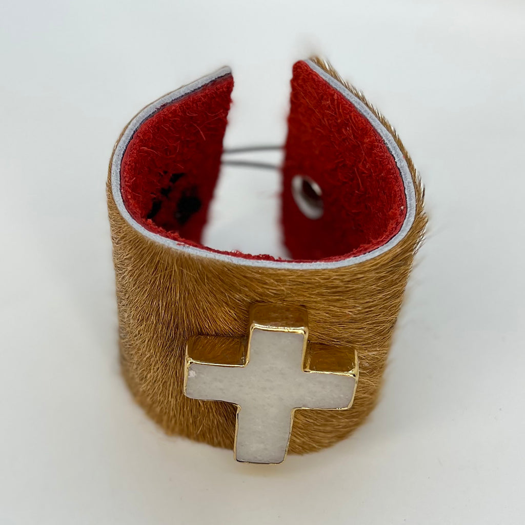 Brazilian brown fur cowhide leather, lined with a soft red leather at the wrist bracelet cuff is adorned with a beautiful white, quartz cross trimmed in a gold-toned bezel. The closure is a fluted copper concho that is adjustable with an elastic loop.