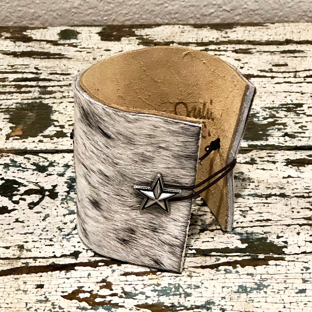 Brazilian, white with brown spots fur cowhide cuff lined at the inside wrist with cream suede leather for comfort. The cuff is adorned with a brown drusy agate. This cuff is adjustable with a stainless steel star closure and elastic loop. The look is edgy western, chic. Makes a great holiday or anytime gift!
