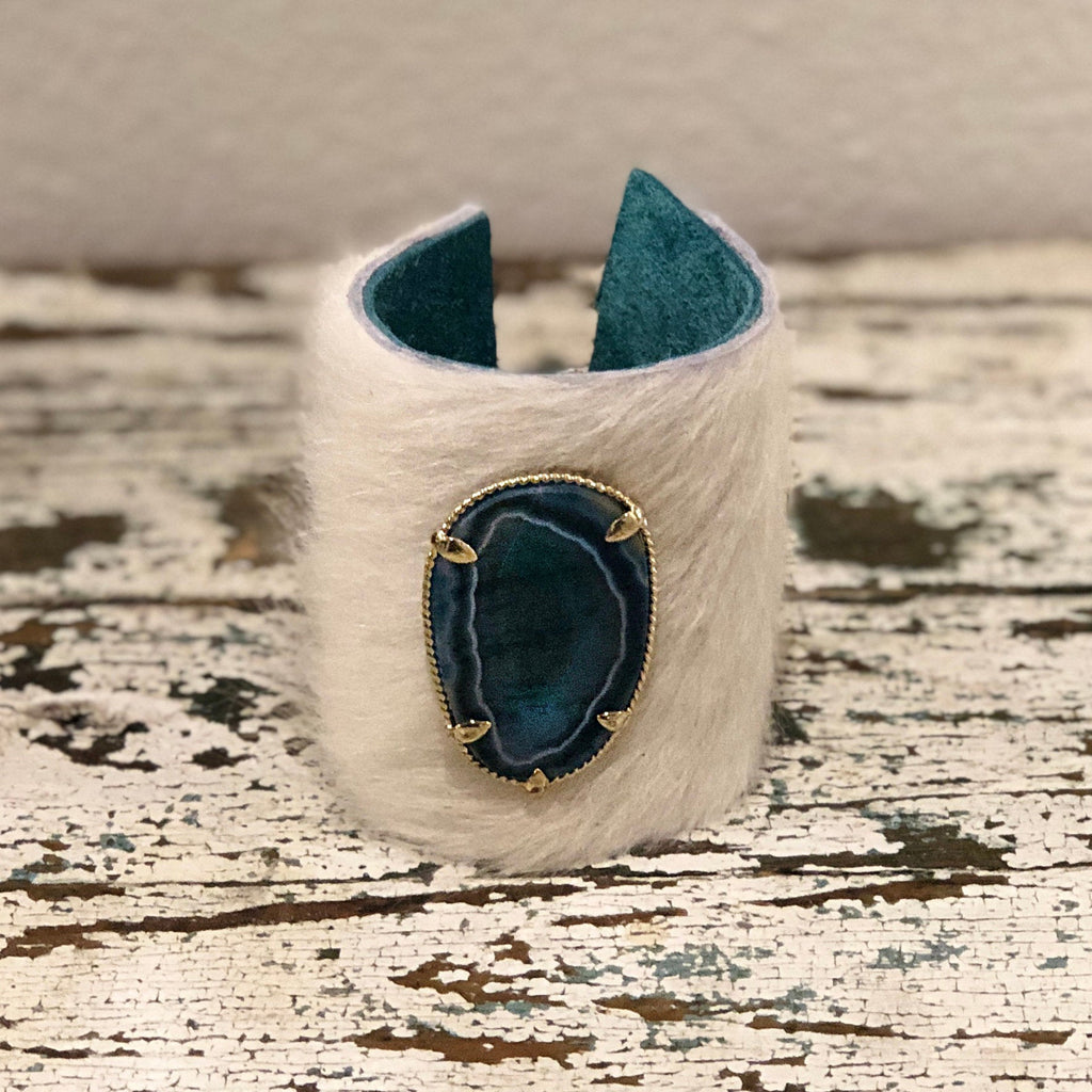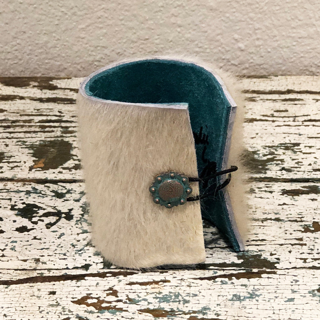 Brazilian white fur cowhide cuff lined at the inside wrist with turquoise suede leather for comfort. The cuff is adorned with a blue Agate slice. This cuff is adjustable with a copper patina flower closure and elastic loop. The look is edgy western, chic. Makes a great holiday or anytime gift!