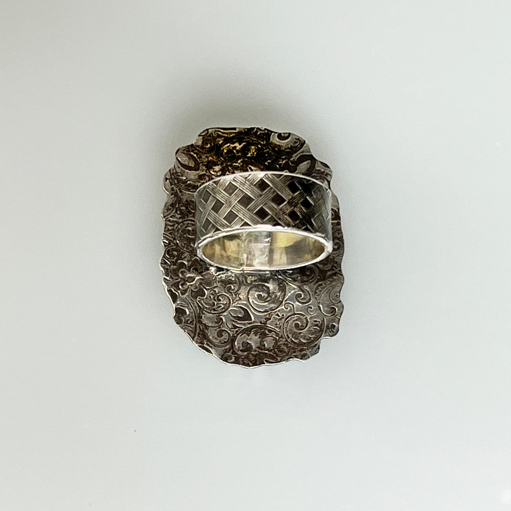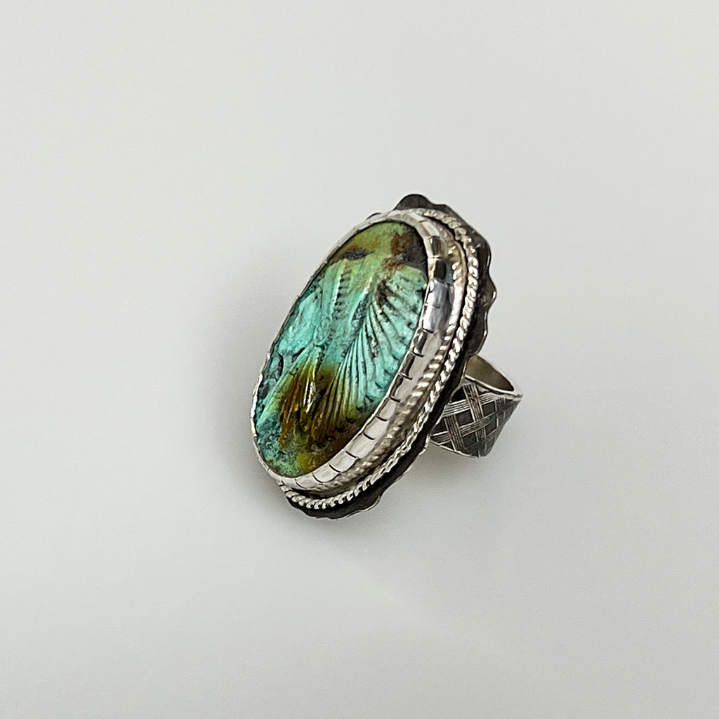 This beautifully, hand-carved Native American Indian wearing a feathered headress has been meticulously carved in profile into a lovely piece of Hubei Turquoise. The carved turquoise is set in to a hand-made sterling silver, castellated bezel setting and wide cross hatch textured, size 8 sterling silver band.