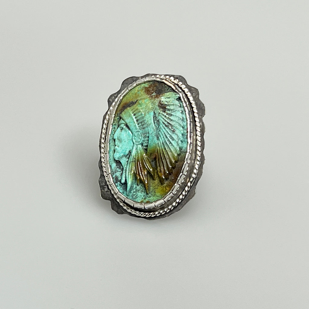 Carved in Turquoise, Native American Headress Profile Sterling Silver Statement Ring