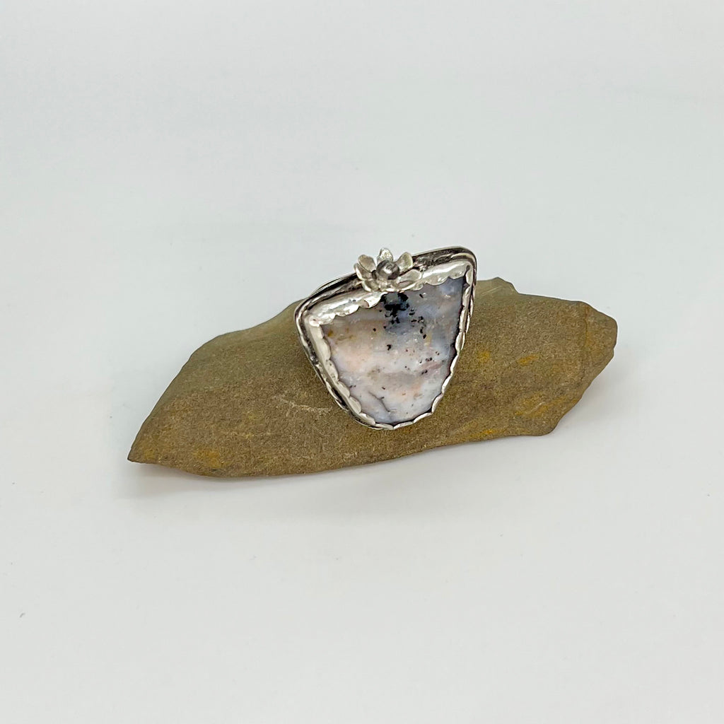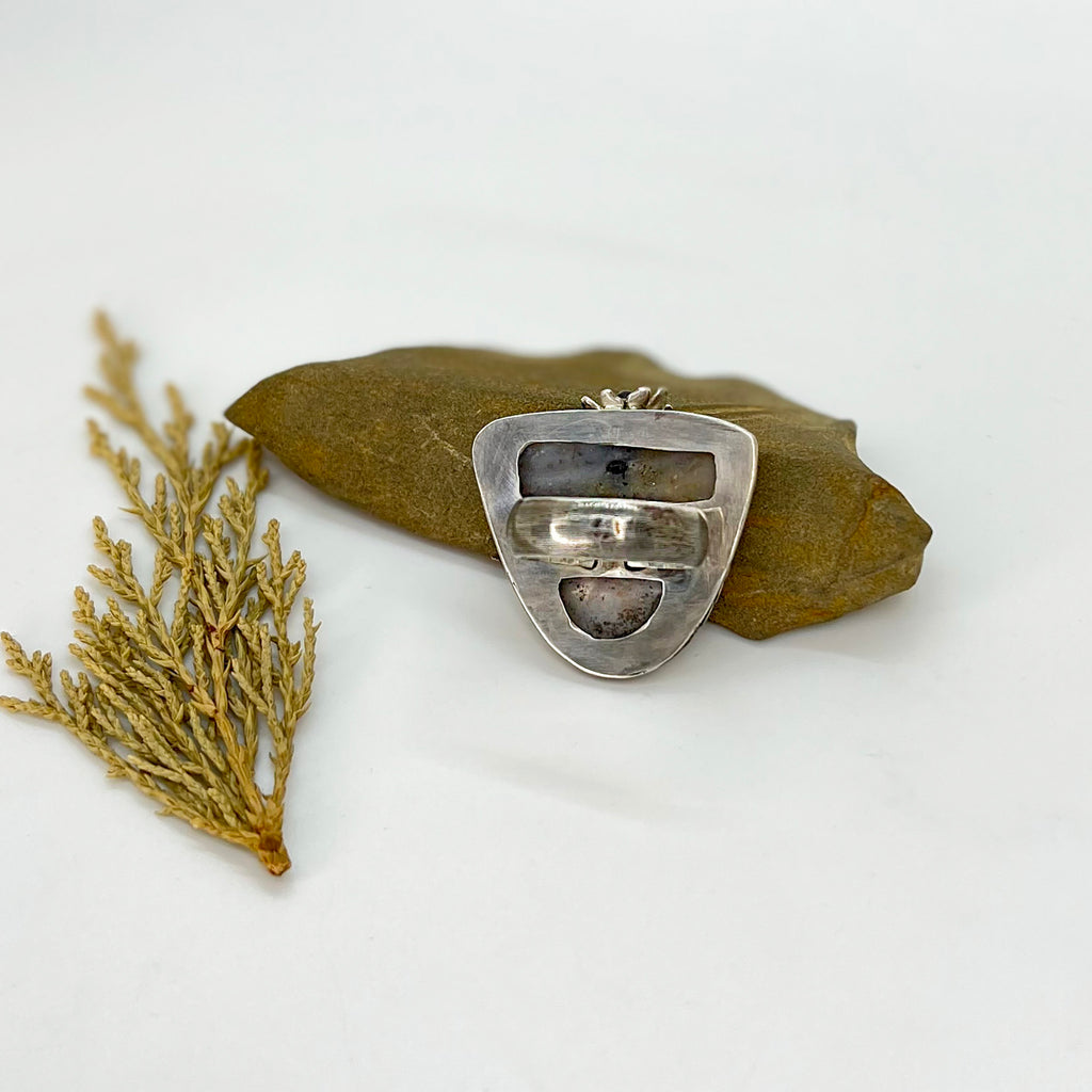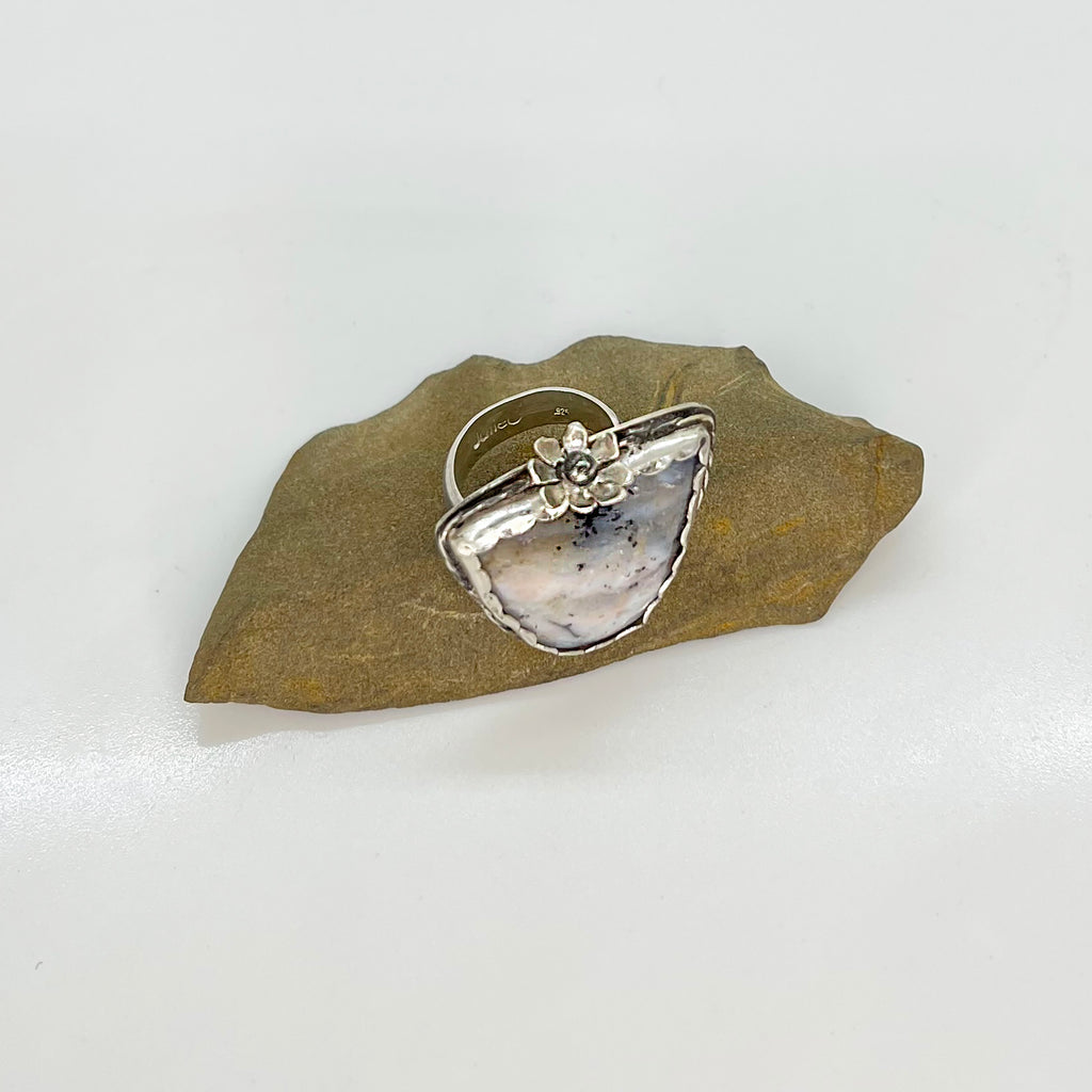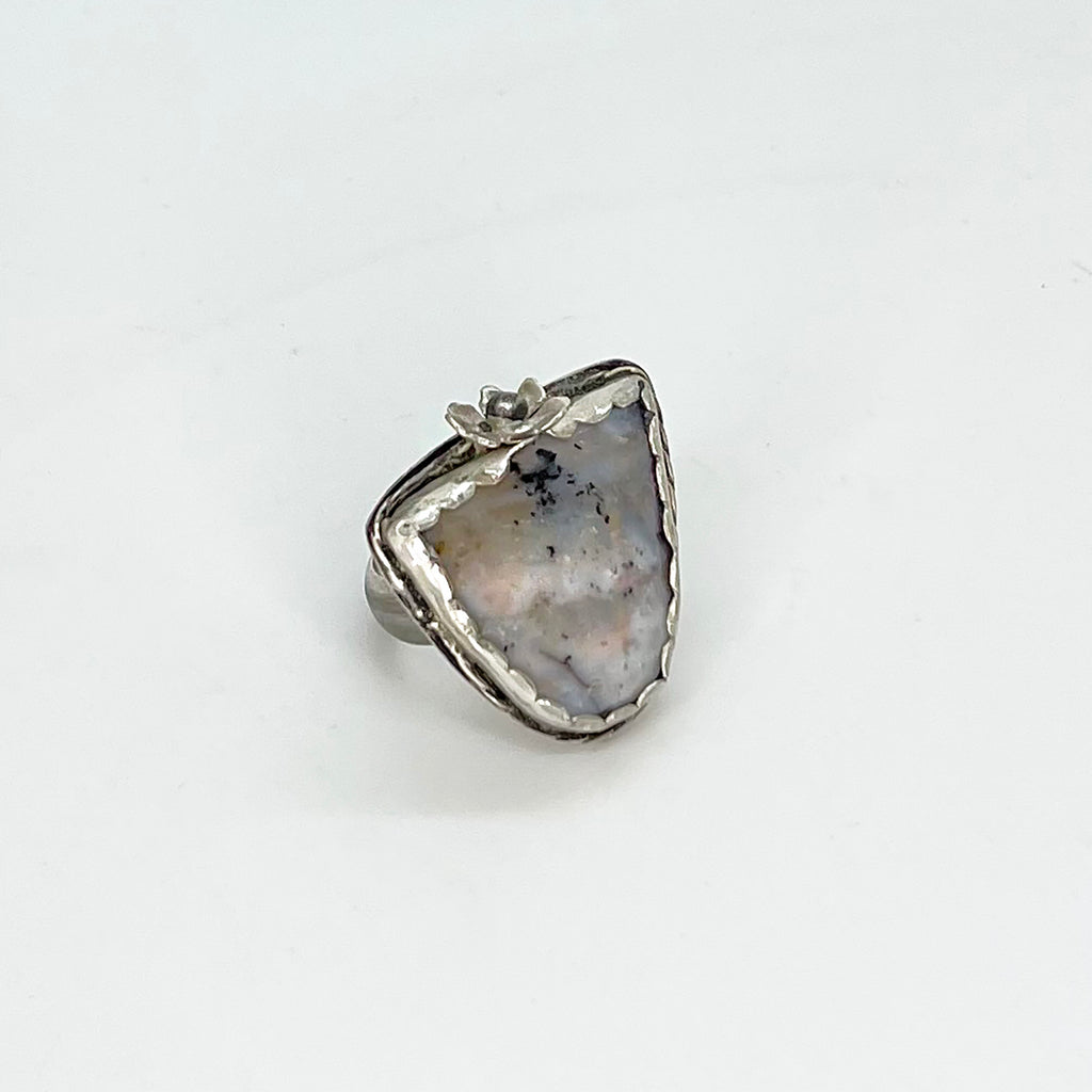 This is a beautiful dome shaped Dendrite Agate set in textured and patinaed sterling silver. These type of agates are known as "picture agates" because the different colors in the stone create a beautiful scene. The flat top end has a small silver flower. It is handmade and a size 6.5.