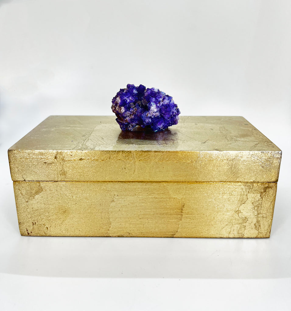Beautiful, small gold leaf decorative storage box adorned with a stunning Amethyst crystal. The box is lined in a rich, black paper liner. Amethyst, in it's spiritual meaning means groundedness, tranquility, and calm. What a beautiful way to bring peace to your room and spirit and get a bit of lovely storage at the same time. This box is a perfect size for rings and things, or lipsticks or perfect for small desk items or just as a decorative item for a table or shelf.