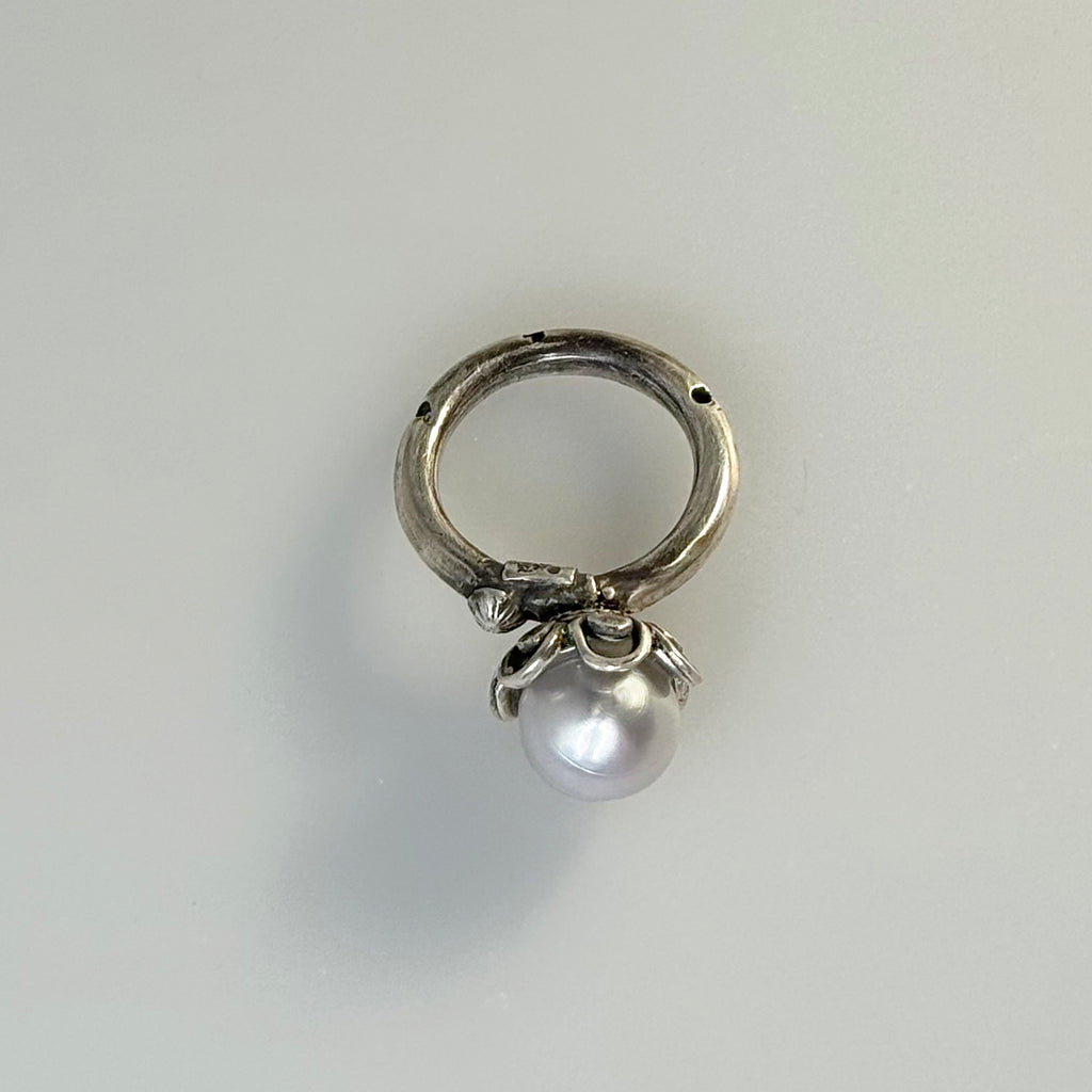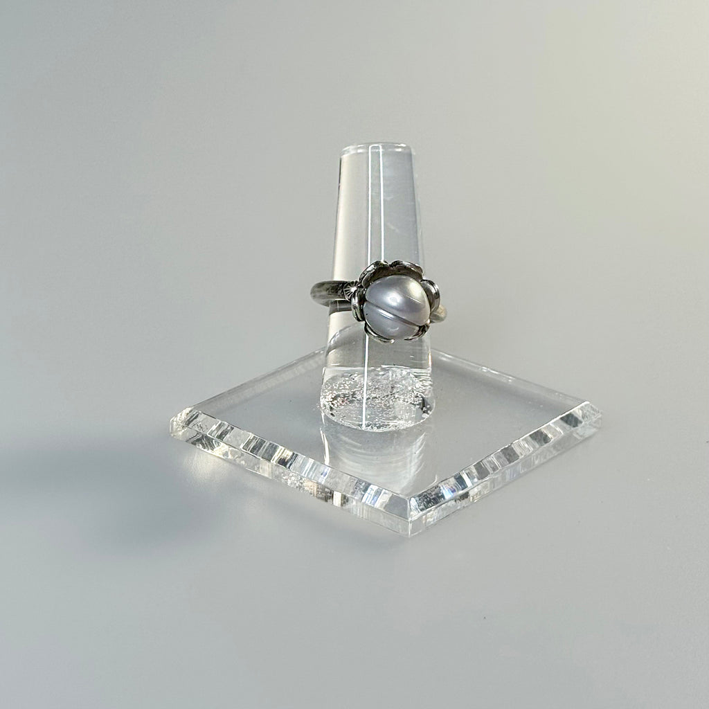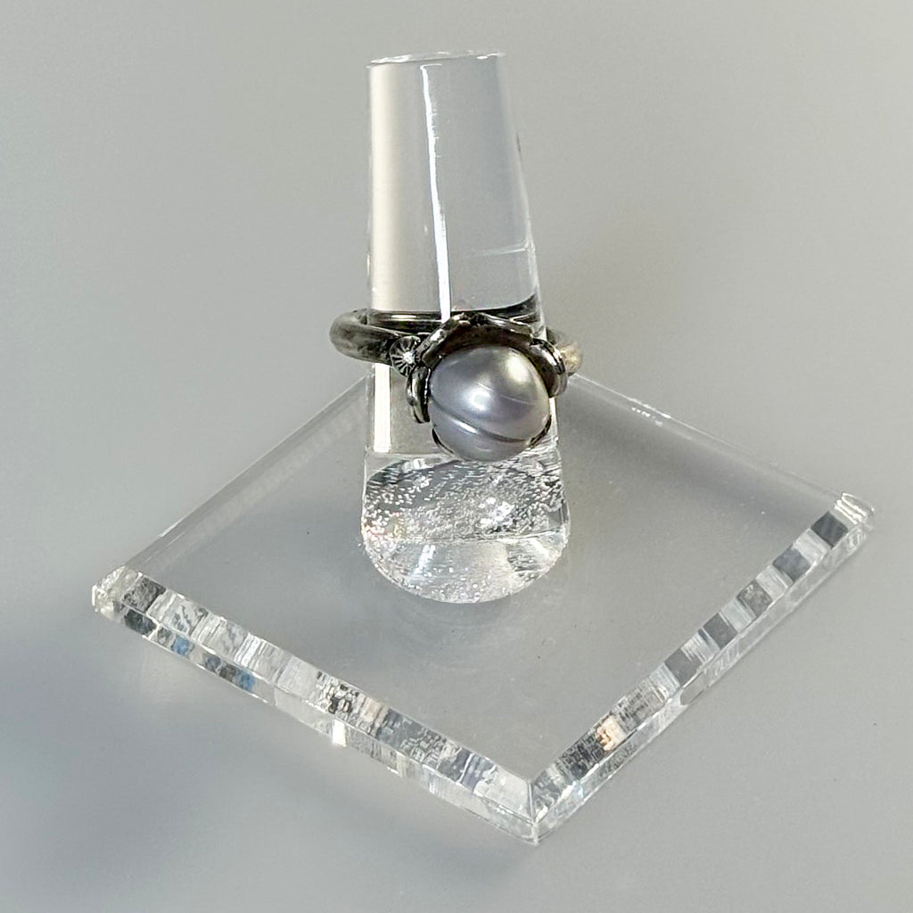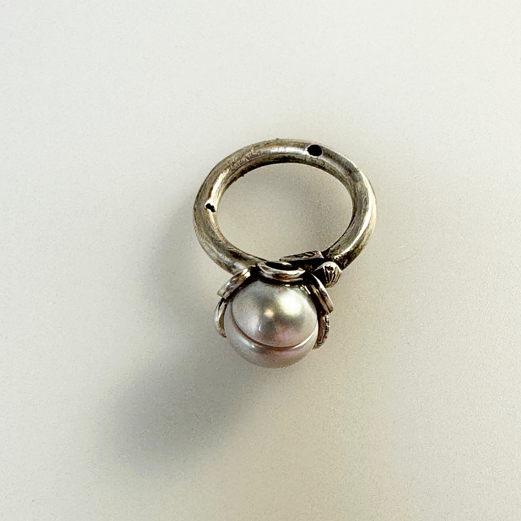 Gray, Baroque, Fresh Water Pearl, Sterling Silver Ring. This is a big hunk of a pearl set in a fun and flirty, silver flower cup. It is both funky and dressy, just depends on the day and the outfit you paired it with. Pearl and flower cup are .50" across. Silver band is texturized and has a patinated finish. Size US 6.25