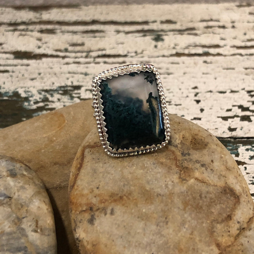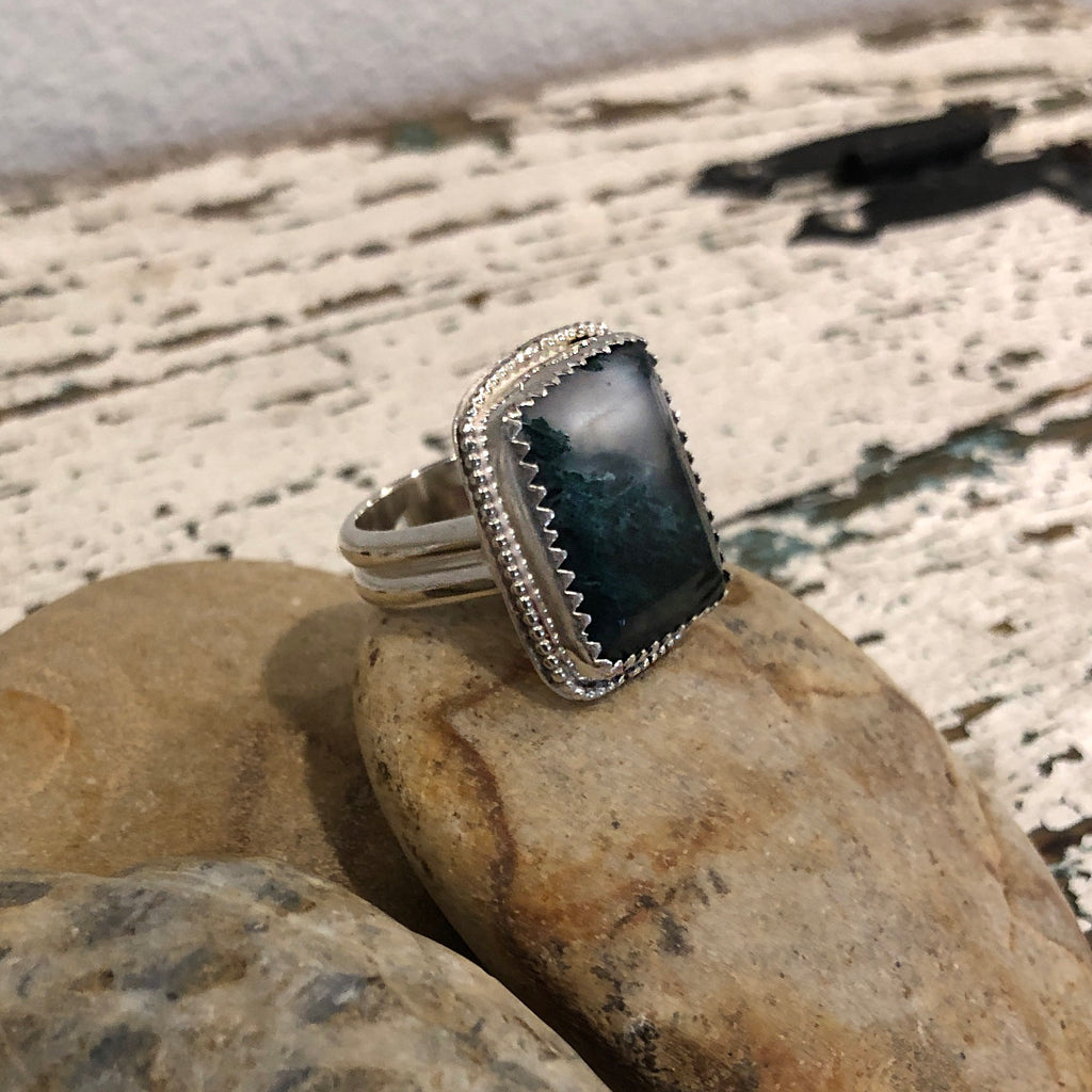 Beautiful .75" by .5" Green Moss, Picture Agate sterling silver ring, size 7.5. The band is made of a comfortable fitting double, half-round wire, .25" wide. The stone shows deep moss greens and opaque blue green white tones.