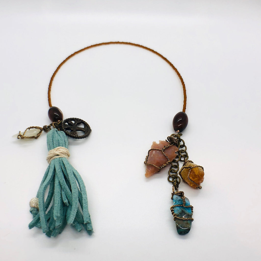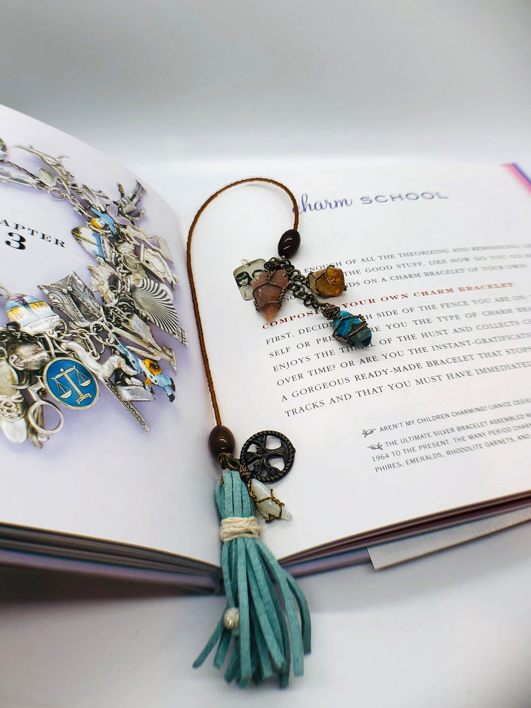 New for summer reading or a special gift for that special someone or for those terrific mom's we know and love. This summer woodland themed bookmark not only offers beautiful aesthetics but numerous soothing qualities all to mark your place in your favorite book. Featured stones are Jasper, Quartz, and Citrine. One end features a bronze tree of life pendant and suede blue tassel and the other end features a beautiful arrowhead. It measures approximately 16" long.
