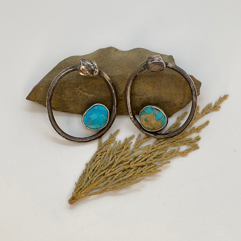 These soft oval Kingman mine, turquoise gemstones sit at the base of two bohemian, rustic sterling silver hoops that have a blackened patina finish. Studs with push backs.