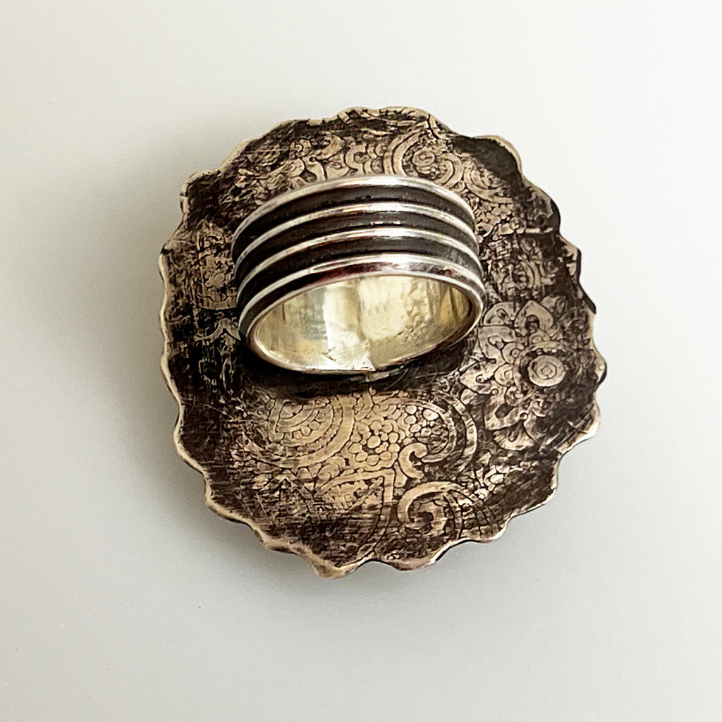 This funky, hand-carved large statement ring is so fun to wear. The stone is a carved turquoise skull, approximately 1.5" x 1" in size. The band is made of sterling silver and is ribbed and patina finished in a distressed black. It is approximately .5" wide and a US size 81/4