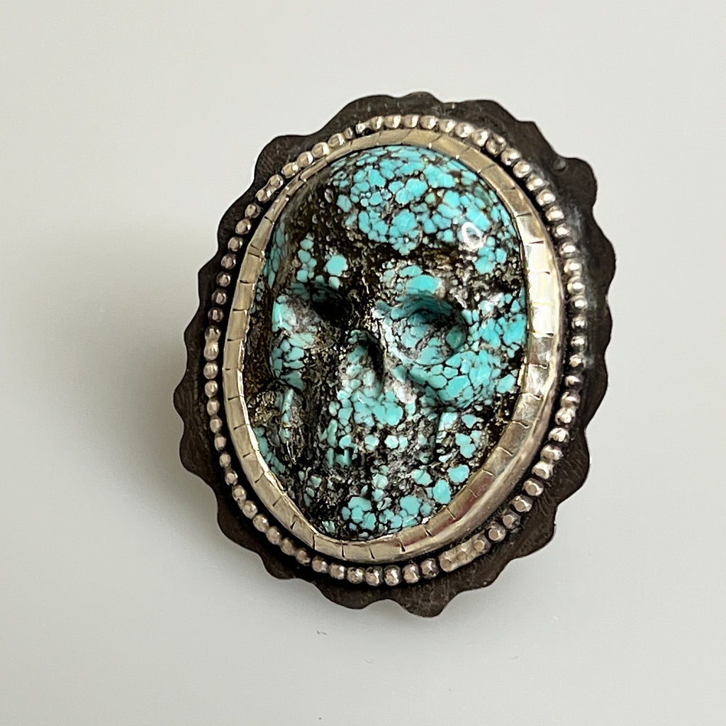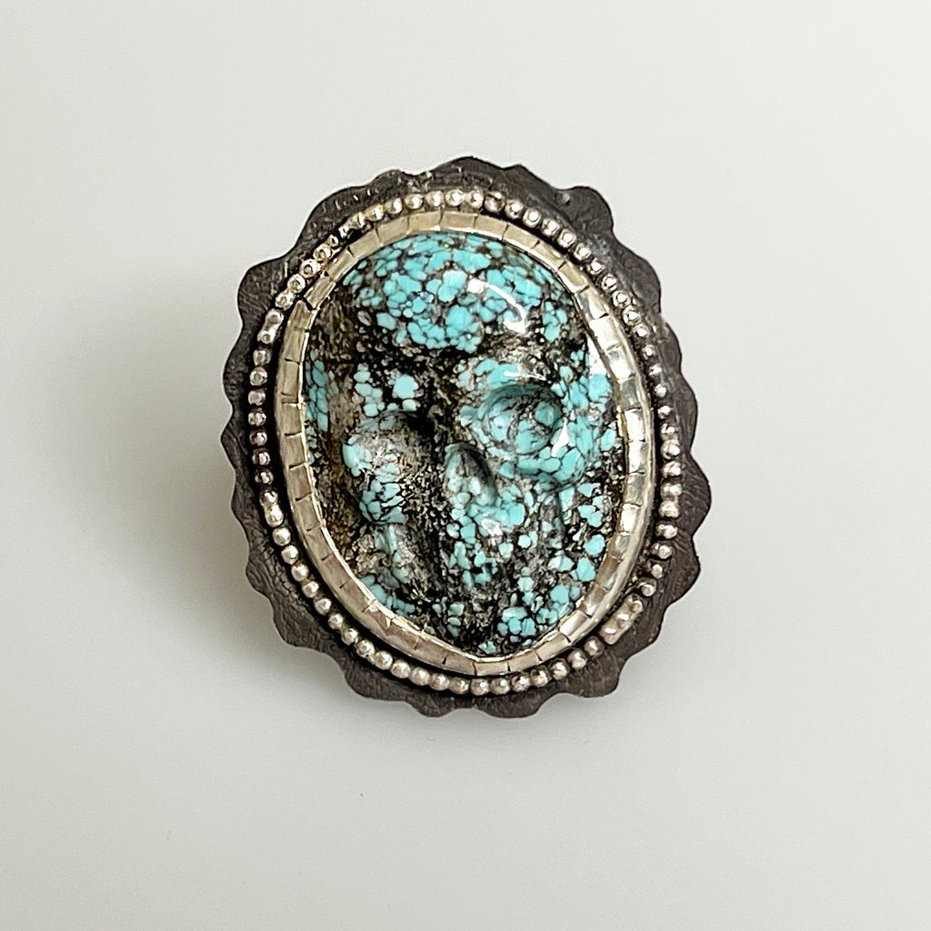 Large Hand-Carved Turquoise Skull Sterling Silver Ring