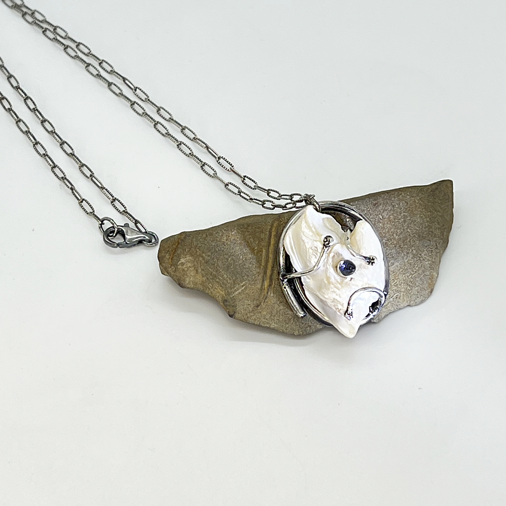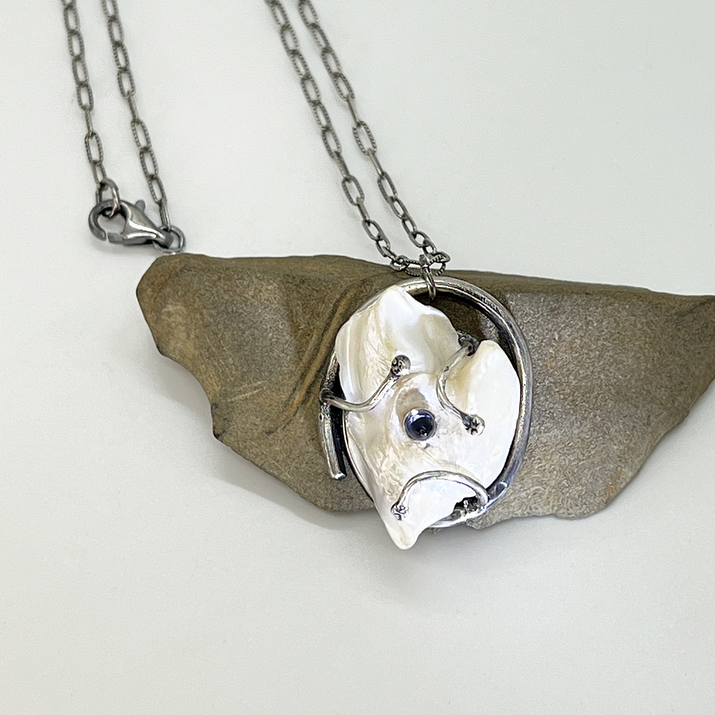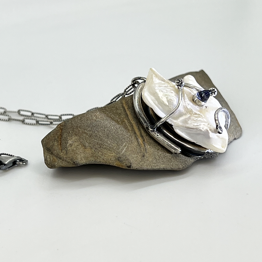 Beautiful, natural freshwater pearl adorned with a bullet shaped 4mm Iolite cabochon gemstone. The pearl sets atop a textured coil of sterling silver and is on a textured 24" sterling silver chain.