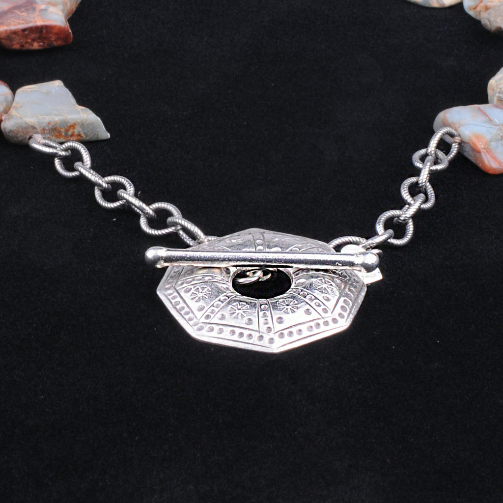 Gorgeous, natural hand-cut rock , African Opals in a graduated necklace. You will find beautiful hues of blue opal with shades of rust and peach, even some threads of red in these stunning stones. The opals are hand-knotted on silk thread. The closer is a large, textured silver, octagonal toggle clasp. This piece will be sure to enhance any outfit for any season. Approx. 24" in length