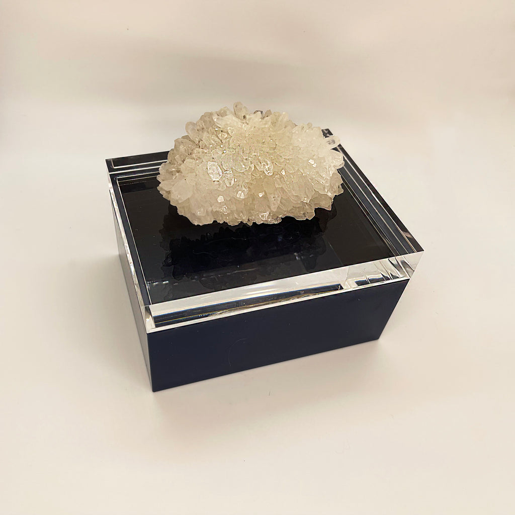 This stunning acrylic and gemstone box would make a wonderful addition to any shelf or table top. It is truly a statement piece. The beautiful multi-point white quartz cluster is simply a one-of-a-kind and shines beautifully atop the dense navy acrylic and heavy top. Box dimensions: 4"w x 6"L x 2.75 H. Color clear, gloss navy; material Acrylic