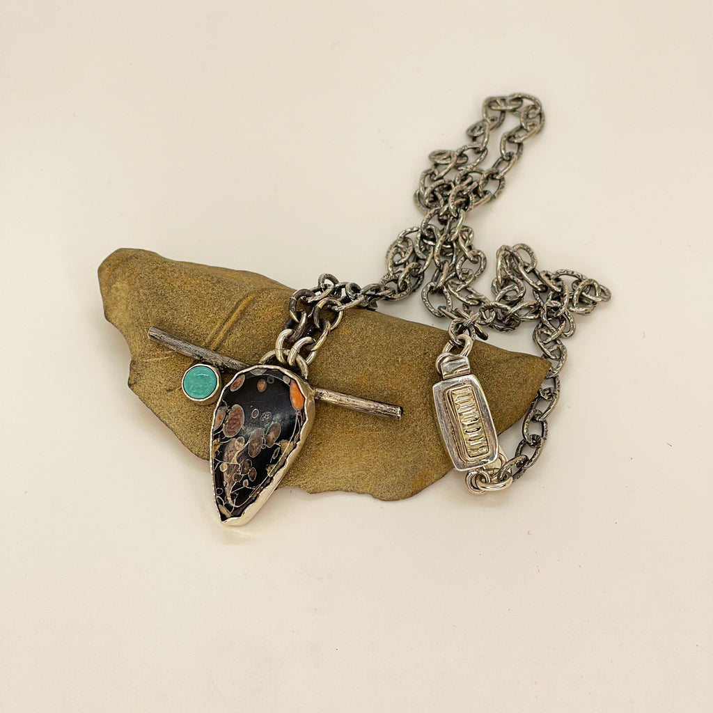 This unusual color scheme for turquoise sets this pendant apart. A jet black backdrop with tiny peach drops adorn this unique stone's canvas. The sterling silver bar the stone rests atop has been distressed to give the feeling of a twig or tree limb. The beautiful 8 mm blue/green Kingman turquoise stone provides a nice pop of accent color to help draw you in. The clasp is a sterling silver and cz box clasp.
