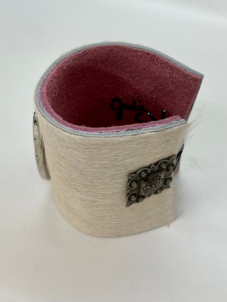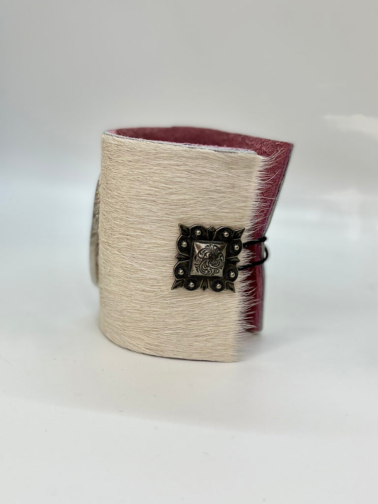 This beautiful white, Brazilian cow hide is adored with a stunning pink Agate slice that is rimmed in a silver-tone accent bezel. The hide is a furry, short hair hide. The overall bracelet measures 6.5 inches in length and 2.75 inches wide. The inside is lined with a soft sueded pink leather for a snug and comfortable fit against your wrist. It has an elastic loop closure that loops over a antiqued or blackened, steel, square flower concho. The closure is adjustable simply by making the elastic smaller or tighter.