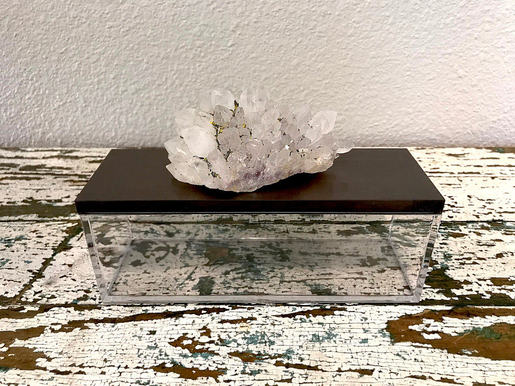 This exquisite gemstone and acrylic box is a stunning accent piece to any table or shelf. It is a lovely way to keep jewelry or things sentimental. It would make a lovely candy dish or desk accessory for office or bath. This is an ideal gift for a special someone. The beautiful Quartz crystal that sits atop this unique shaped box is white with trace amounts of Amethyst running through it. Quartz crystals are said to be ideal for healing any condition, and are known for their purifying, healing and soothing effects. Combined with Amethyst, a crystal that promotes power, protection and wisdom, how could you go wrong having this box nearby.