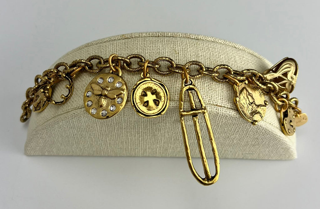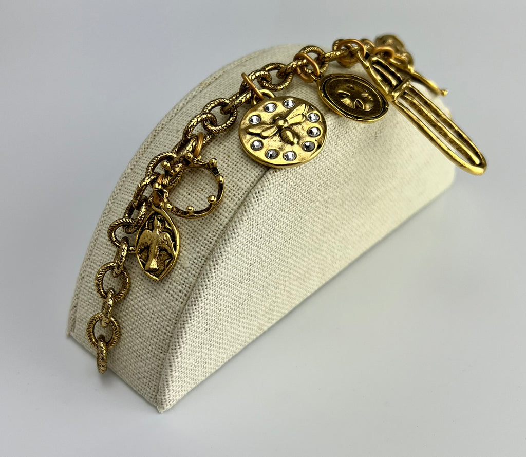 Vintage styled 14k gold plate French charm bracelet. There are eight charms. A large Cross Charm, a Dragonfly charm surrounded by 9 crystals, a lock, a basket, a French coin, a Maltese cross charm, a crown and a small cross medallion. The 14k plate cable chain is 8.5" in length.