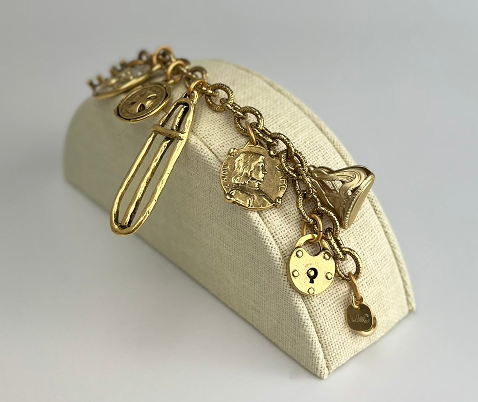 14K Gold Plate French Coin Cross and Medallion Charm Bracelet