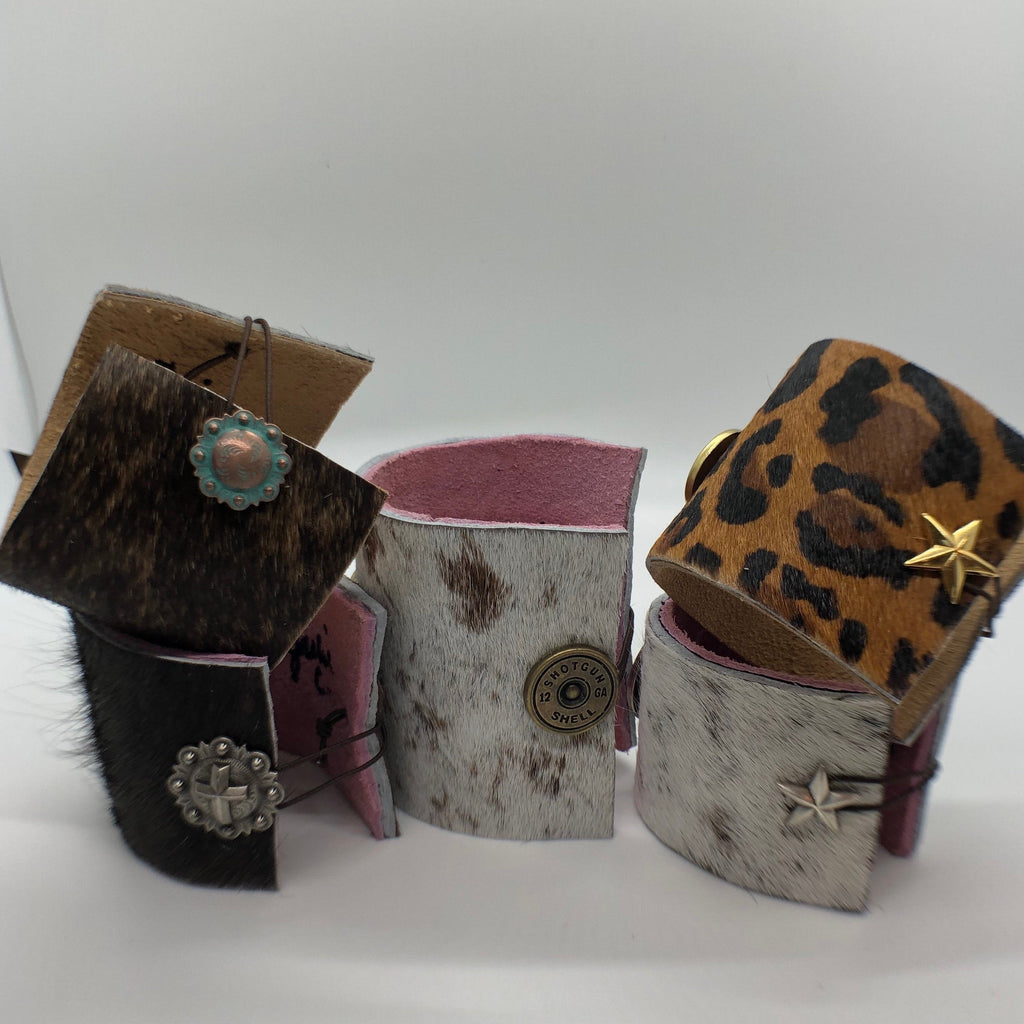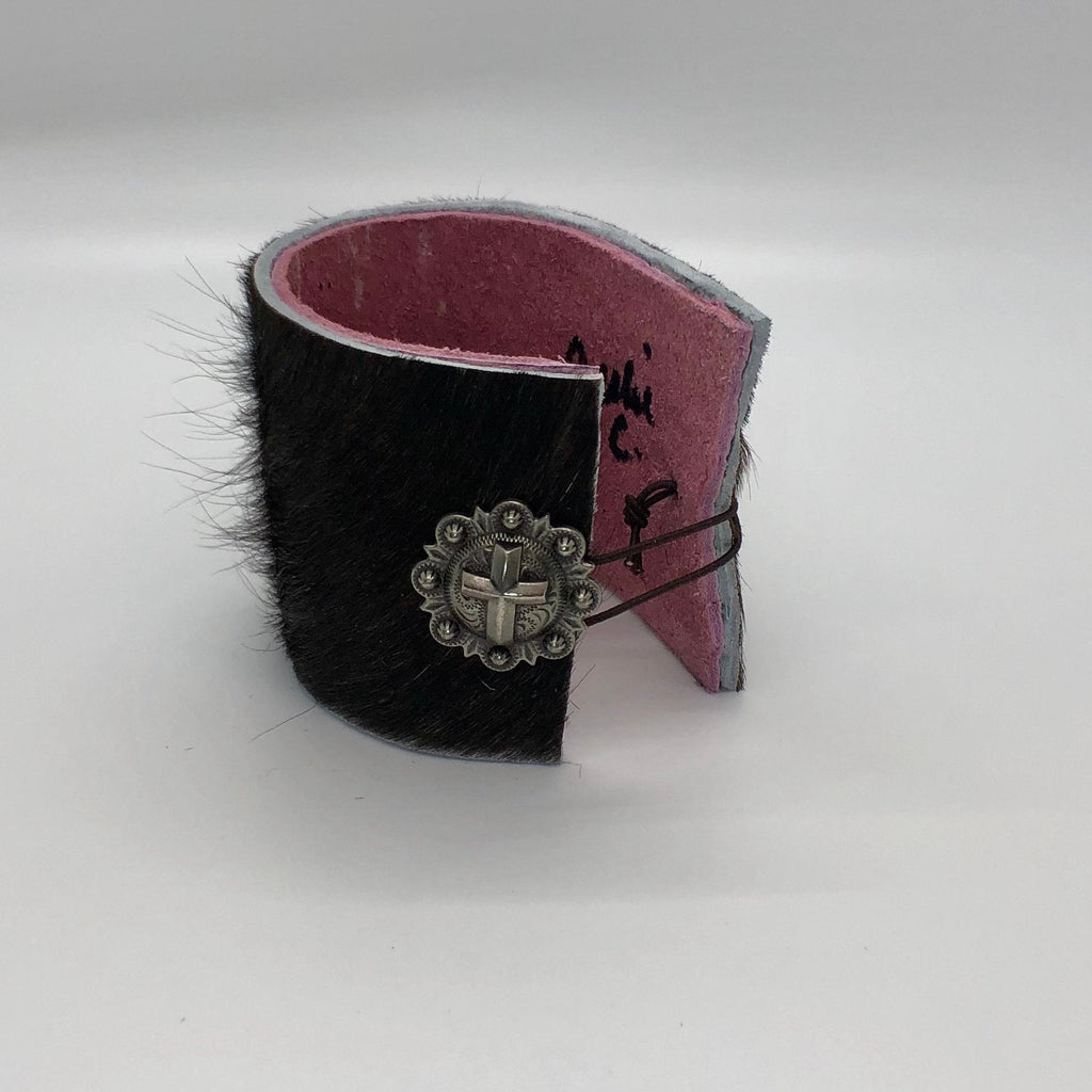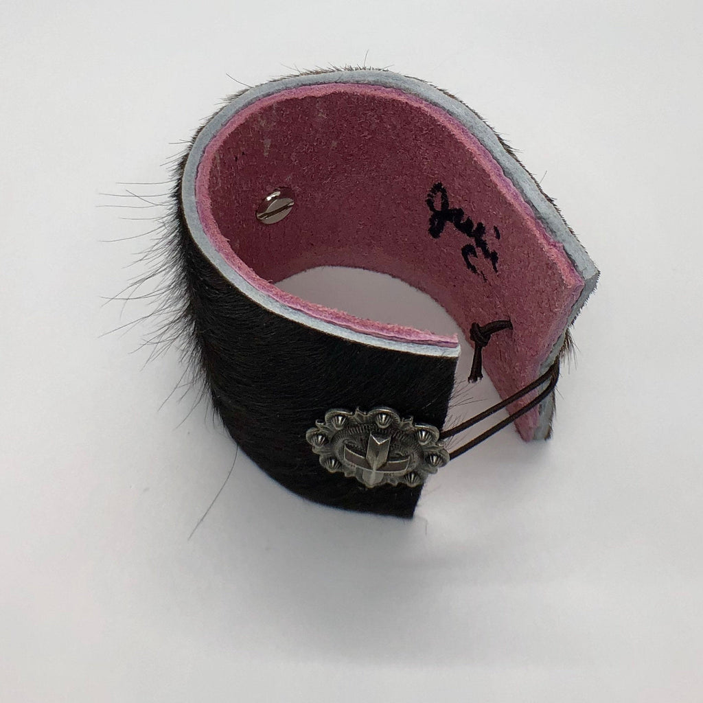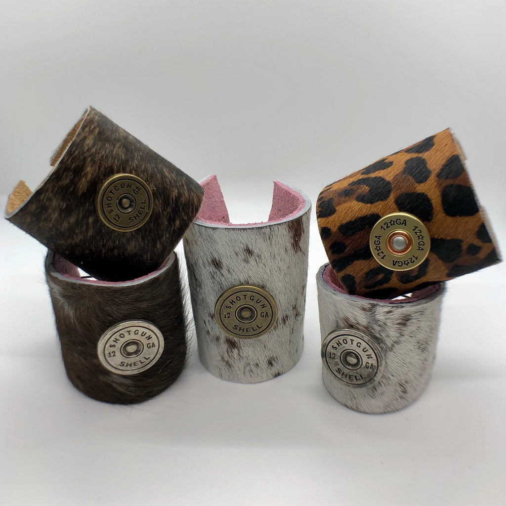 Brazilian brown fur cowhide cuff bracelet adorned with a 12g shotgun shell. This bracelet is lined with a soft, pink leather for comfort and stability. I created this line to support the moms of my daughter's high school clay shooting team, just a little something for all they do to support their kids. This cuff has a stainless steel cross concho closure which is adjustable with an elastic loop.