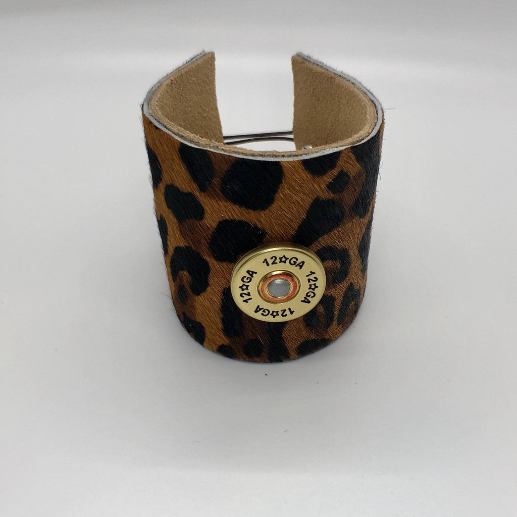 Brazilian Hide leopard print fur 12g shotgun shell cuff. This bracelet is lined with a soft, beige leather for comfort and stability. I created this line to support the moms of my daughter's high school clay shooting team, just a little something for all they do to support their kids. This cuff has a brass star concho closure which is adjustable with an elastic loop. length 6.5" width 2"