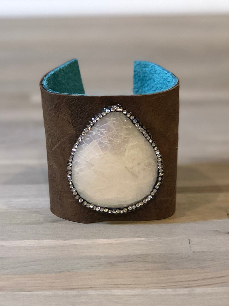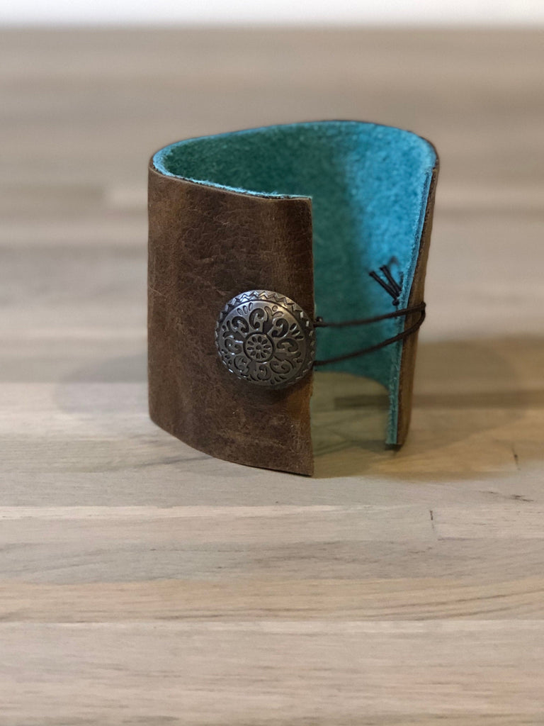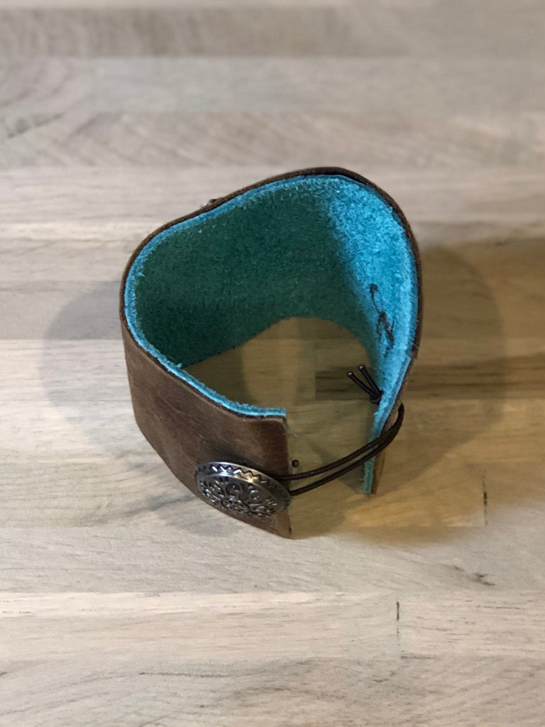 Handmade leather cuff, made of double sided leather, two-tone distressed brown on the exterior and turquoise on the inside of the wrist. Adorned with a beautiful mother of pearl shell surrounded by rhinestones. Rustic Chic! The clasp is an adjustable elastic over an ornate antique button.