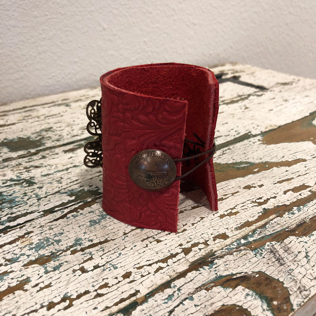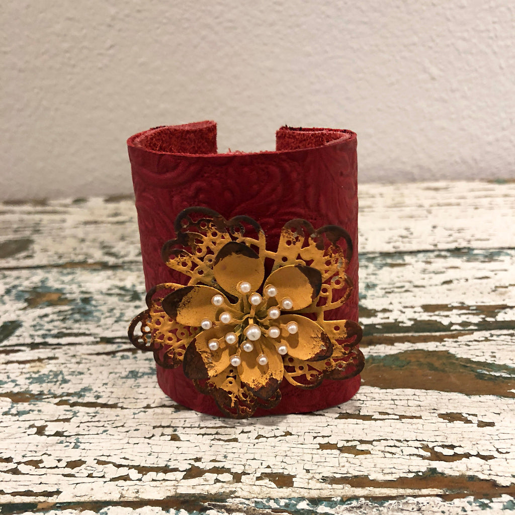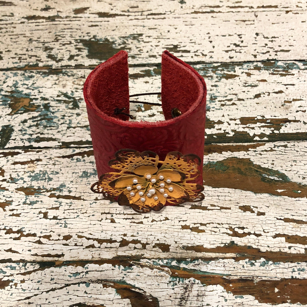 Orange Metal Flower on Hand-tooled Red Leather Cuff