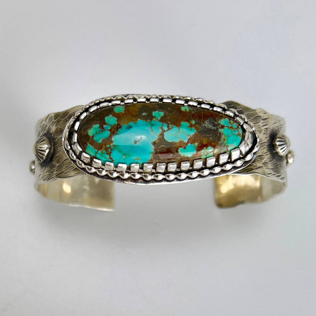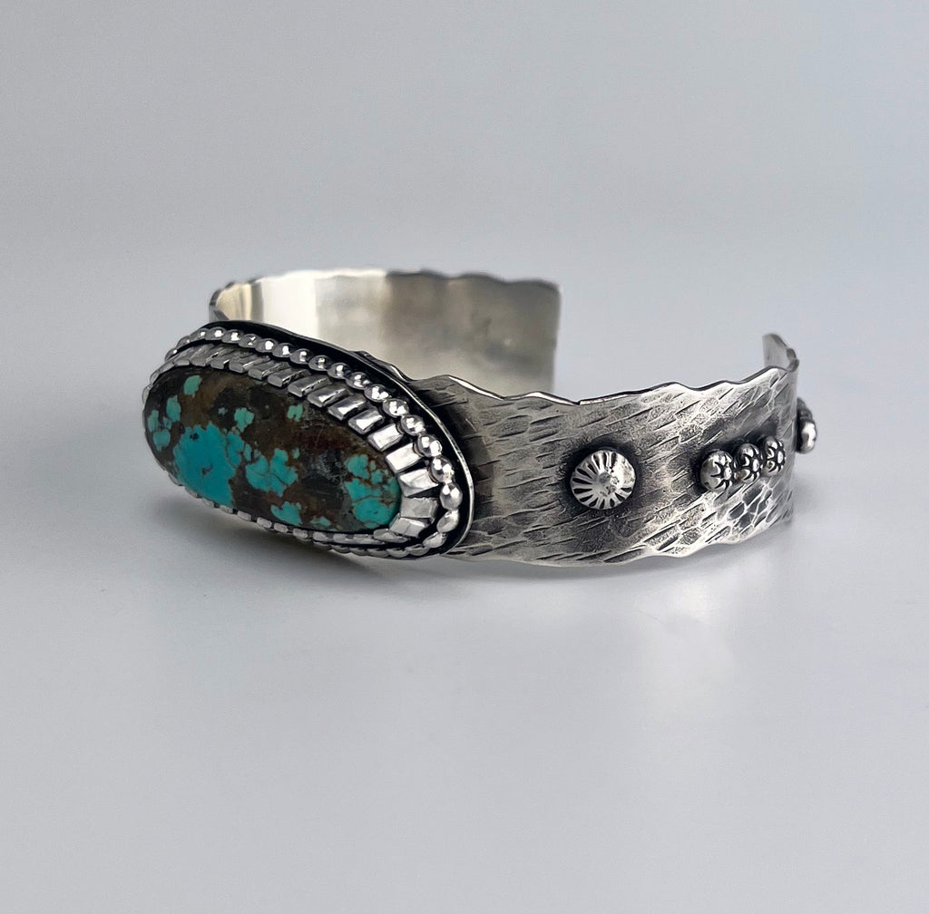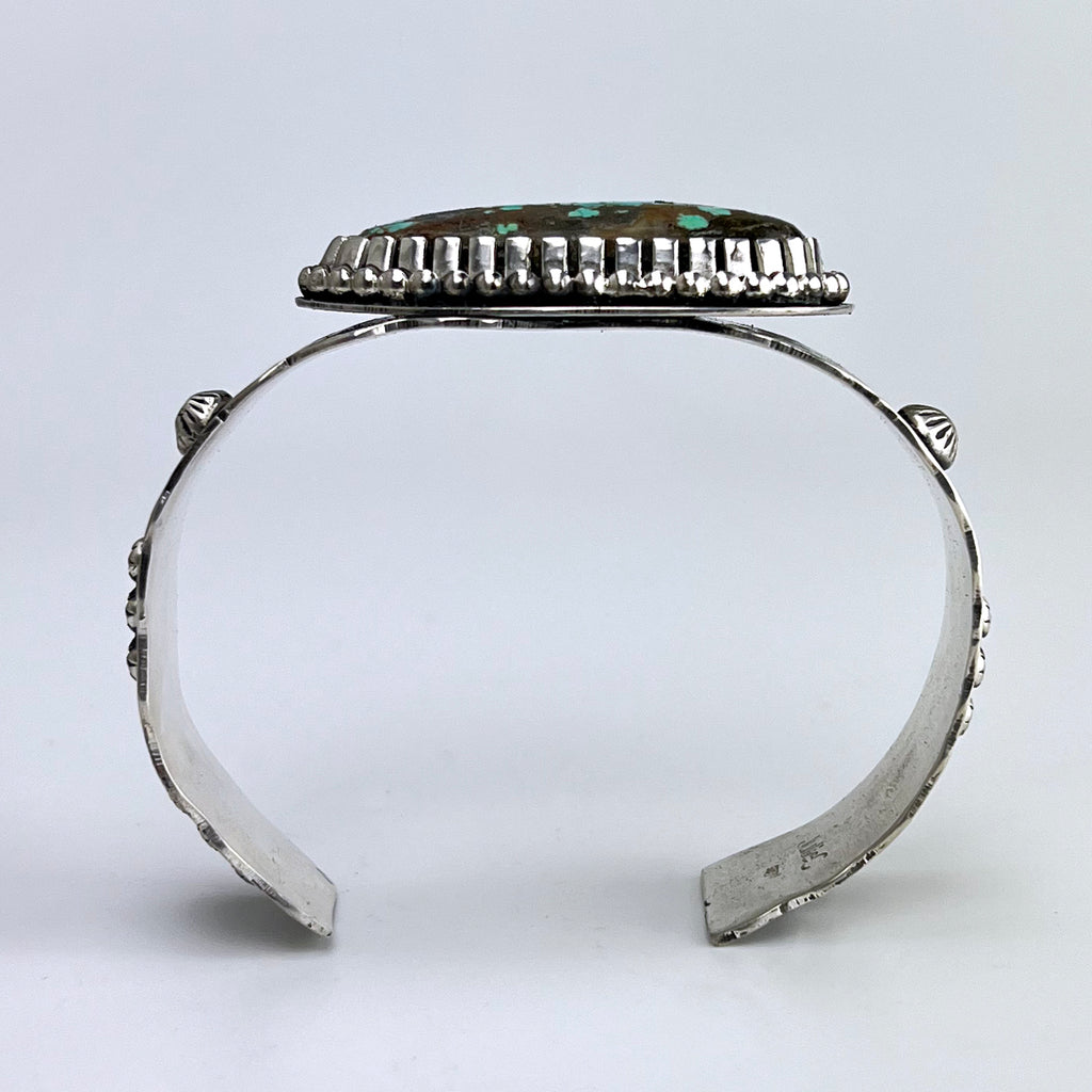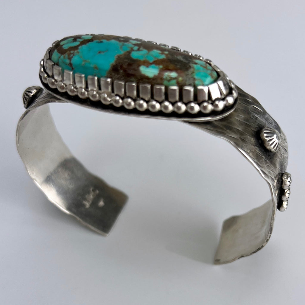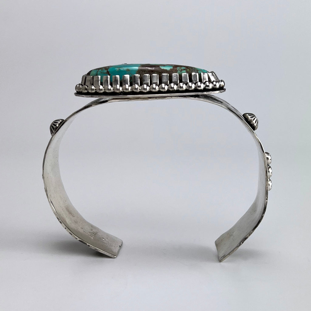 Sterling Silver Cuff Bracelet with No 8 Turquoise set in a Castellated Bezel