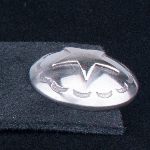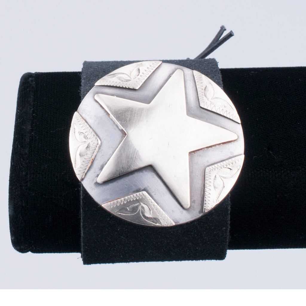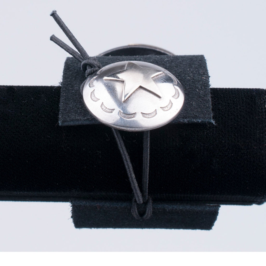Sterling Silver and black leather, these hand-made stars were originally made to embellish saddles, but they make wonderfully bold bracelets. The bold Texas Star is a great accessory whether you are from Texas or not. An elastic closure is adjustable for a custom fit and hooks over another smaller silver star adorning the back of the bracelet. This bracelet is available in brown as well as black and may be made to order in custom leather colors. Prices may very due to color and availability of colored leather. The feature star measures approx. 2" across.
