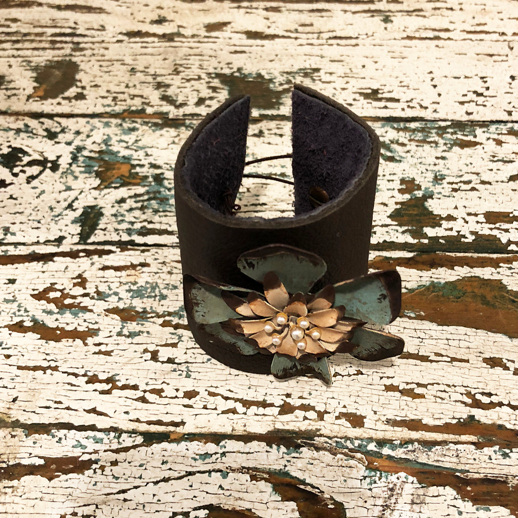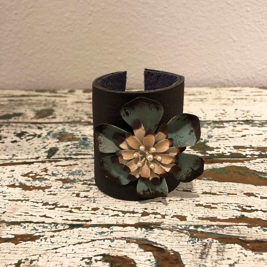Turquoise Flower on Hand-Made Brown Leather Cuff