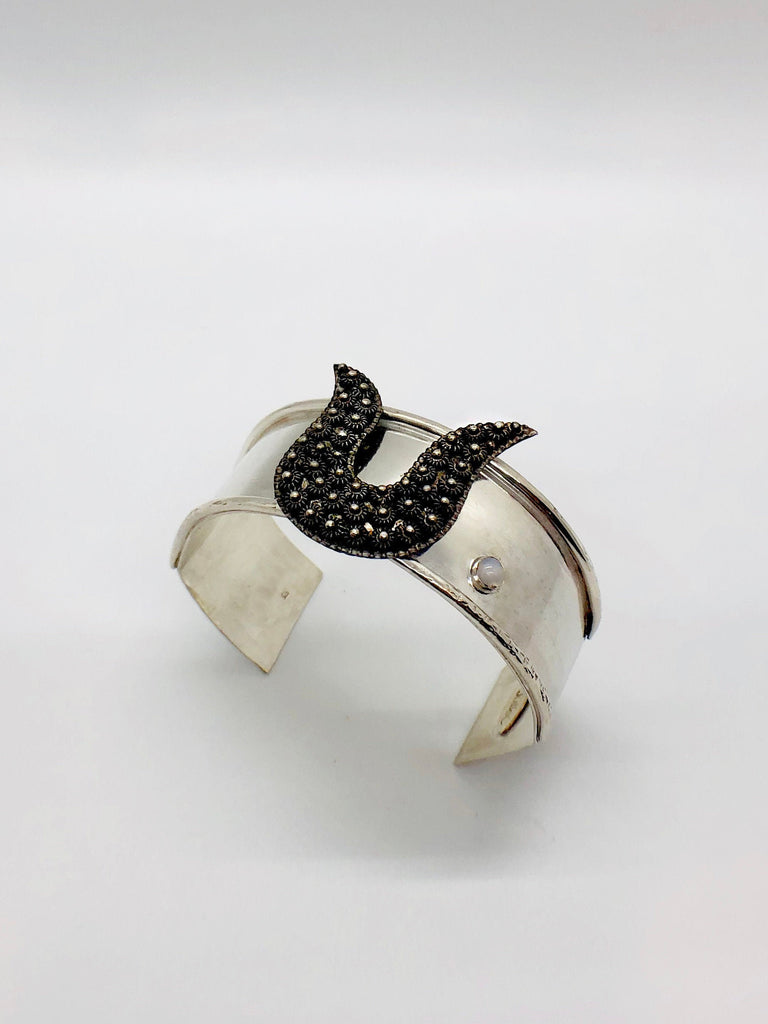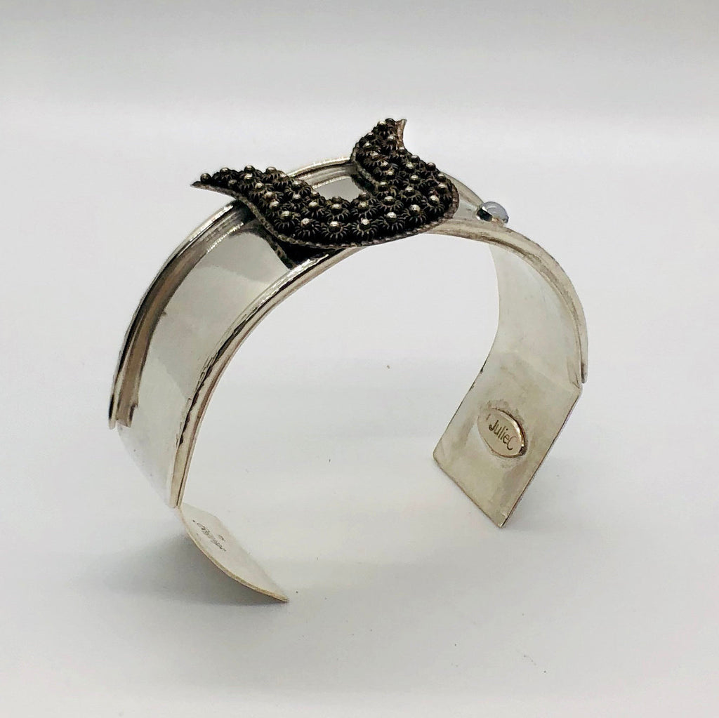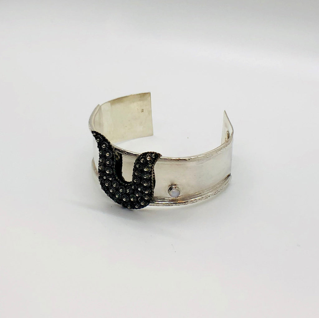This sterling silver cuff bracelet is adorned with a vintage sterling brooch and a beautiful 4mm Iolite accent stone. The sides of the bracelet have a raised, textured edge and the ends of the bracelet are hammered to provide a texture that will help[ hide scuff marks from tabletops. The sterling silver of the bracelet has been gently darkened/aged to better match the coloring of the brooch.