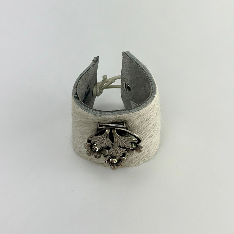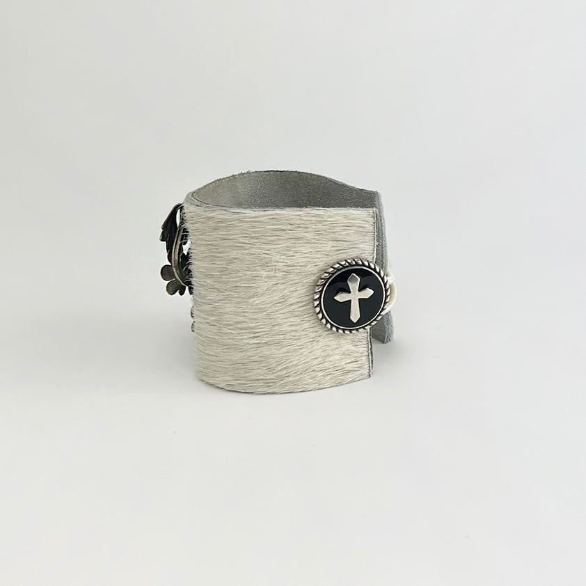 Vintage crystal cross set against a rustic brown scroll framework shoe buckle adorns Brazilian fur cowhide. The closure is a stainless steel cross concho in which a white silk knots over it to close. Streams of silk dangle from the cuff to give it a dreamy, vintage look and feel. Adjustable