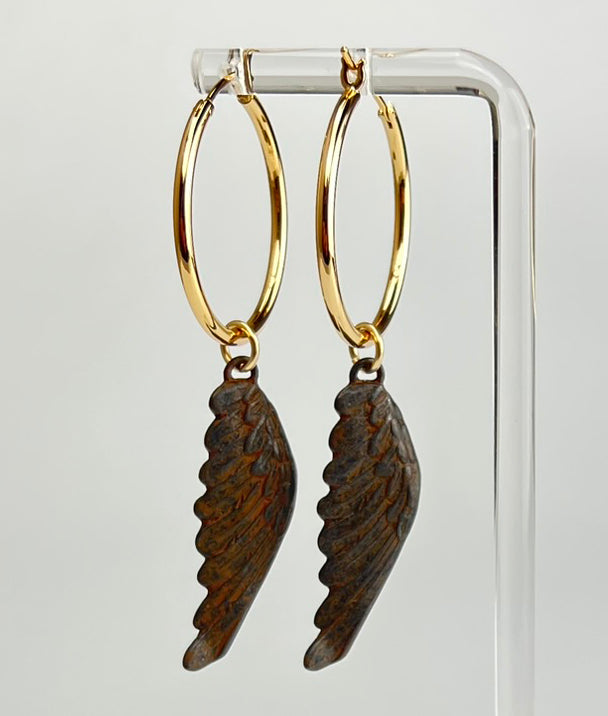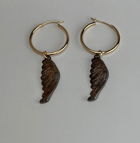 Fly high with these 14K gold hoop earrings featuring beautiful bronze angel wings. Perfect for adding a touch of whimsy to any outfit, these earrings will make you feel like a true angel. Say hello to your new heavenly accessory!