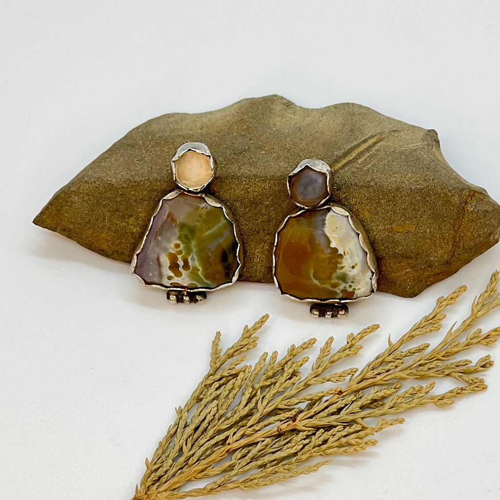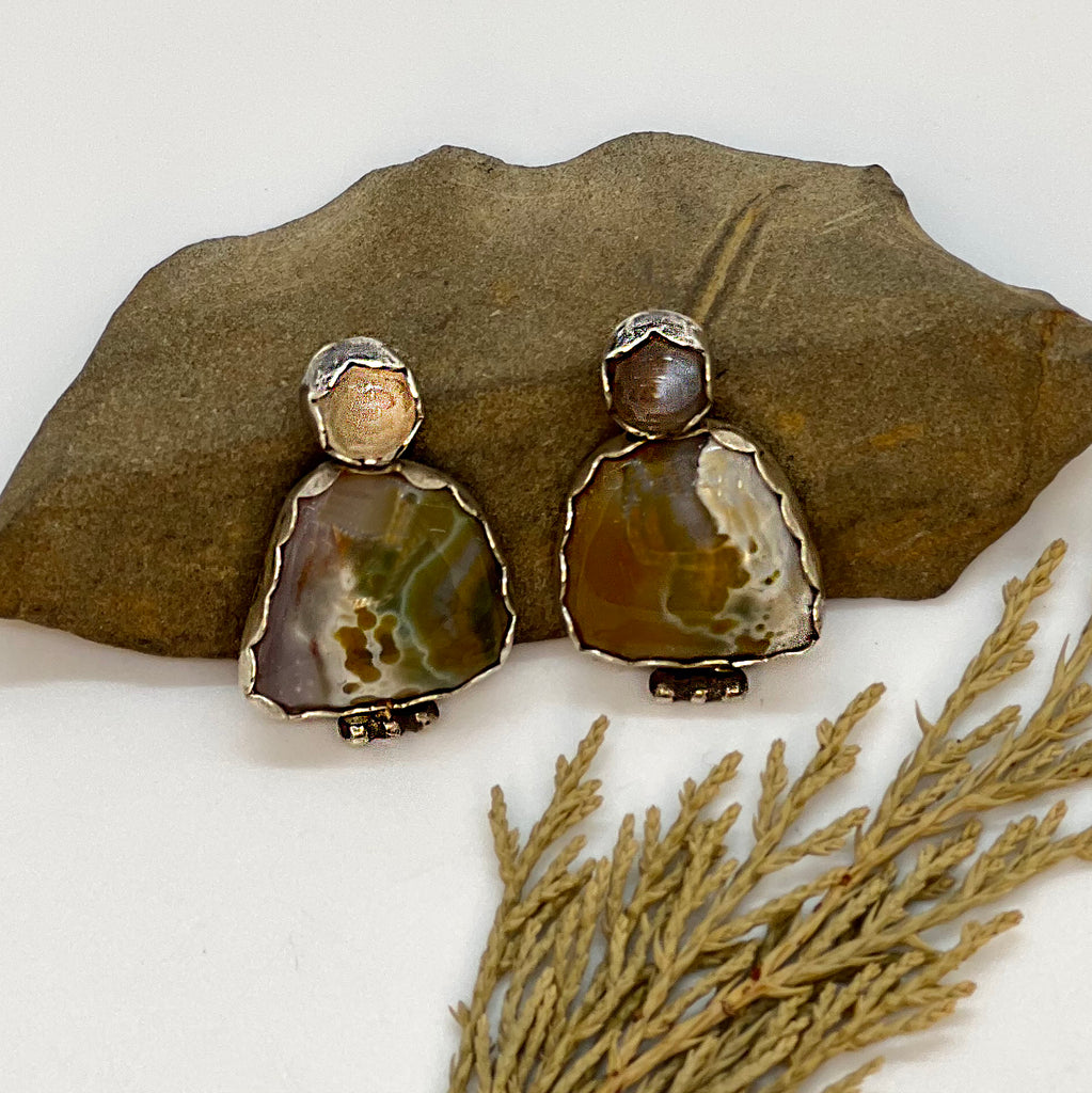 These beautiful Jasper and Moonstone earrings are truly one-of-a-kind. Each stone in and of itself is slightly different in shape and color. In addition, one moonstone is a peach moonstone and one is a gray rainbow moonstone. They are set in sterling silver and are posts with push-back closure. With all this color going on, I am not sure there is much they would not go with.