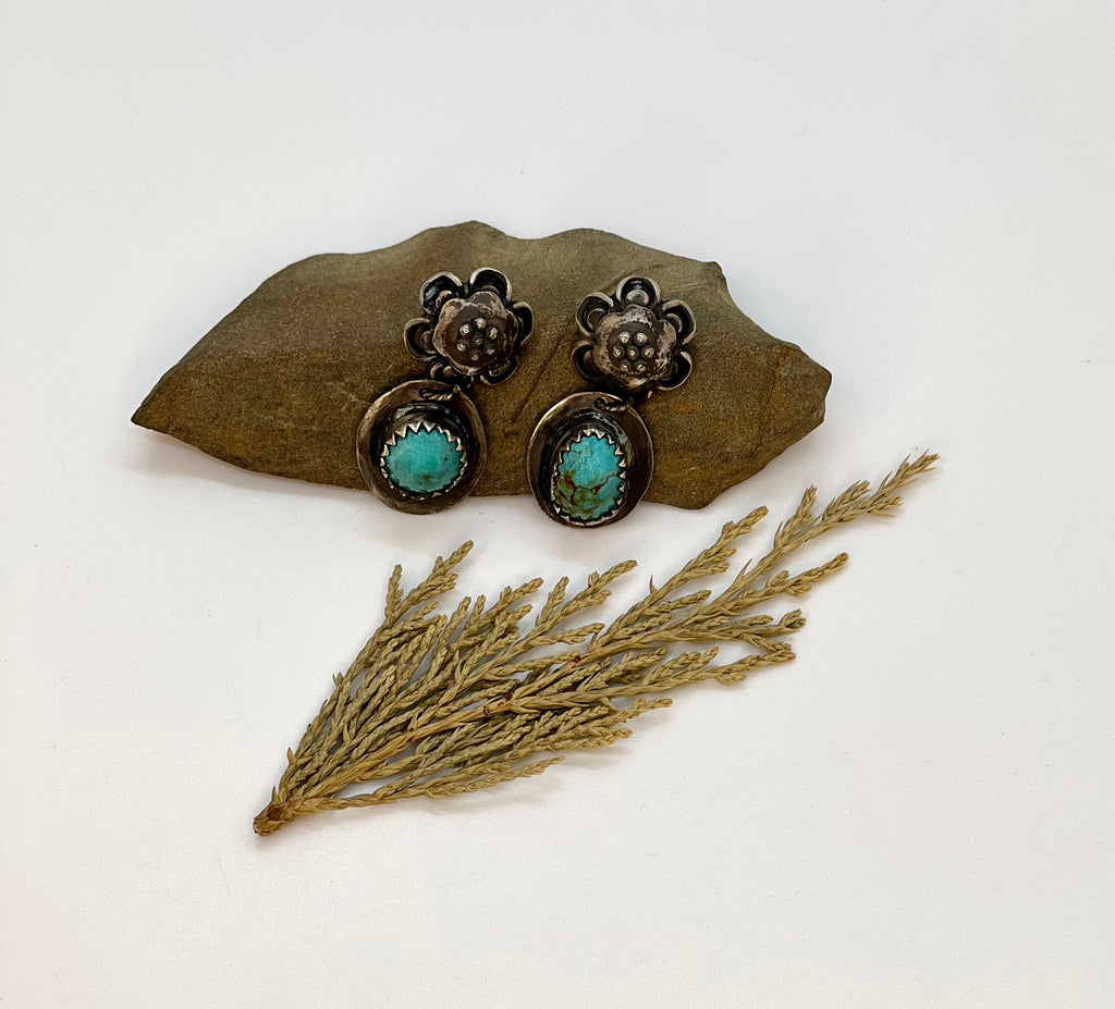 These beautiful pair of Kingman mine, oblong turquoise stones are set in sterling silver that have a black patina finish. The design is a bohemian, rustic floral dangle. Studs with push backs.