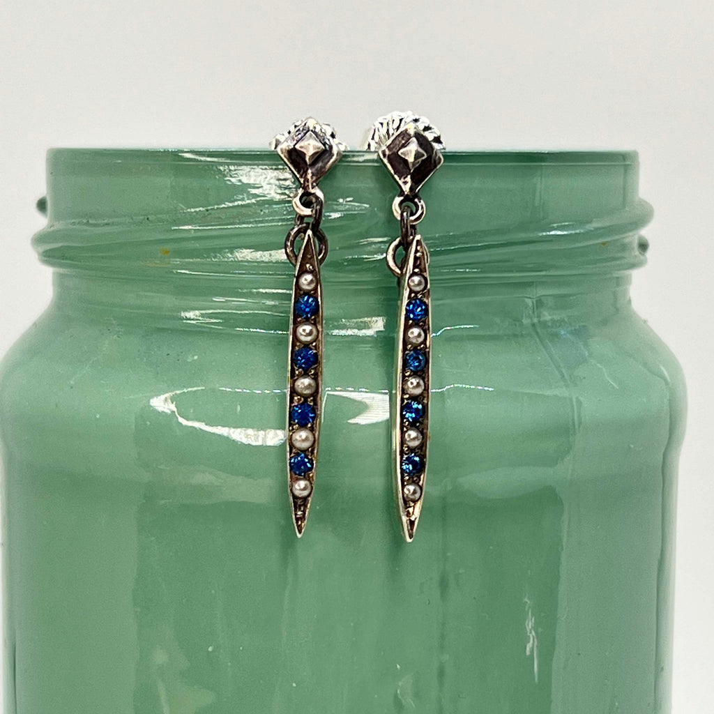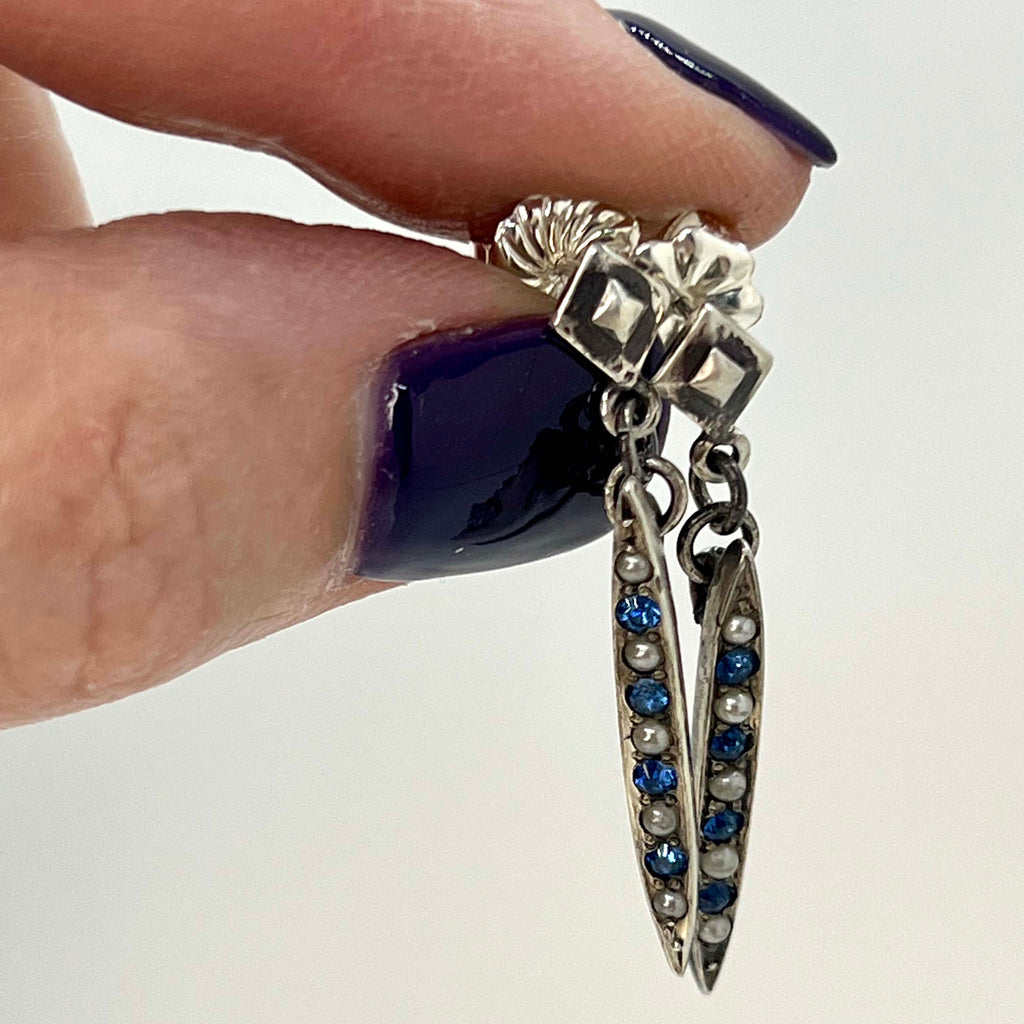 These matching antique lingerie scatter pins are circa 1920's. Lingerie pins were use to pin and hide undergarments like slips and bras from the top of your clothing. These beautiful pins are made of sterling silver, pearls and blue spinel. I converted them to an earring by removing the pin and adding the post top.