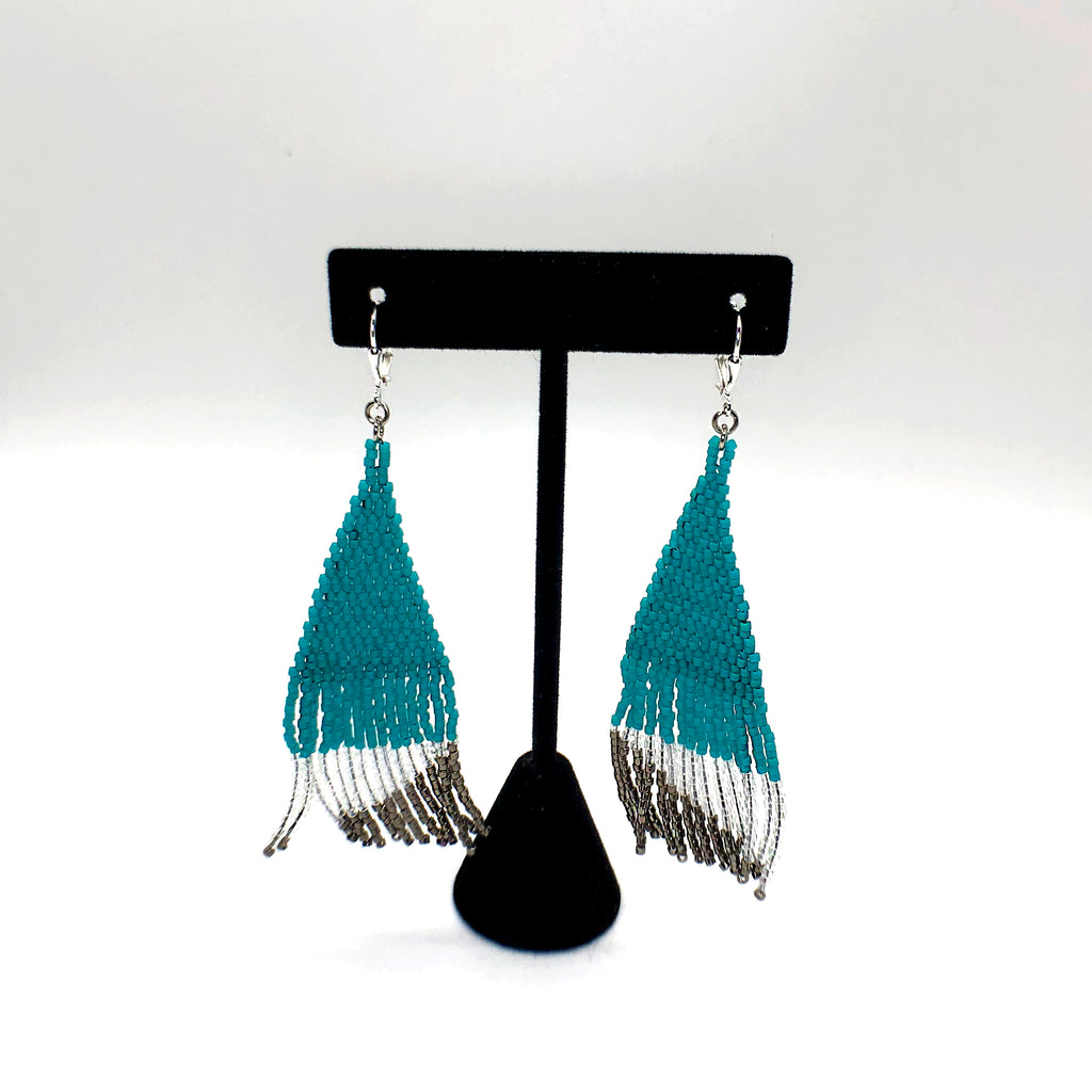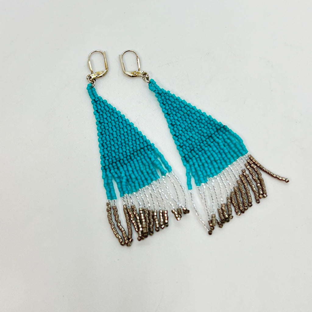 Stunning Turquoise, silver and white shoulder dusting, Native American styled glass seed bead triangle dangle earrings. Silver plated lever back. Overall drop approx. 3.75", dangle 3".