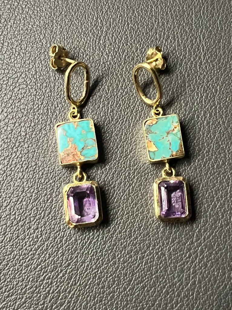 Turquoise and Amethyst Drops, Gold Filled over Sterling Silver, Posts