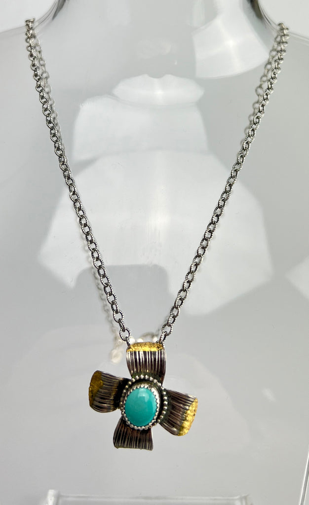 Embrace the daring spirit within with our Sterling Silver and (2.2ct) Sleeping Beauty Turquoise, natural, Dogwood Pendant. Crafted with boldness and adventure in mind, this pendant features stunning turquoise stones and a dogwood design for a striking and unique look. Dare to stand out. The chain is 20 inches long.