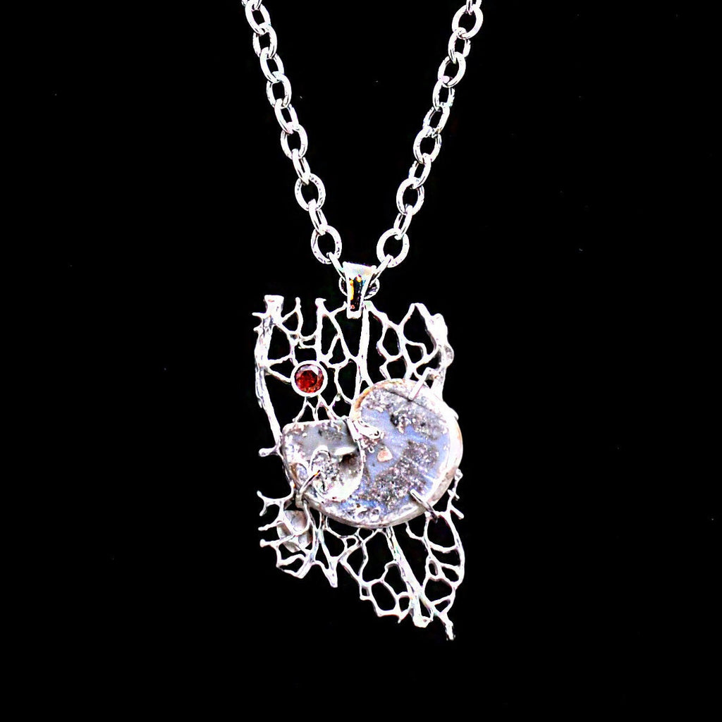 Beautiful Ammonite fossil shell with drusy crystal accents within shell is highlighted by a stunning red, cabochon garnet. The backdrop is a spiny lattice web of silver. Sterling silver, texture cable chain is 24" in length. This piece would add a touch of elegance to any outfit.