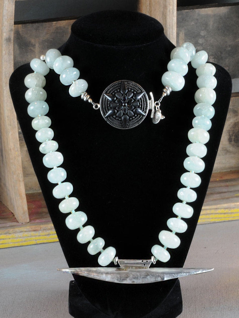 Large 10 to 12 mm Aquamarine rondelle beads in a beautiful light, sea foam blue highlight a hand-formed 3" sterling silver piece. The antique, carved jet and sterling silver clasp measures and inch wide and the overall length of the strand is approx 24".