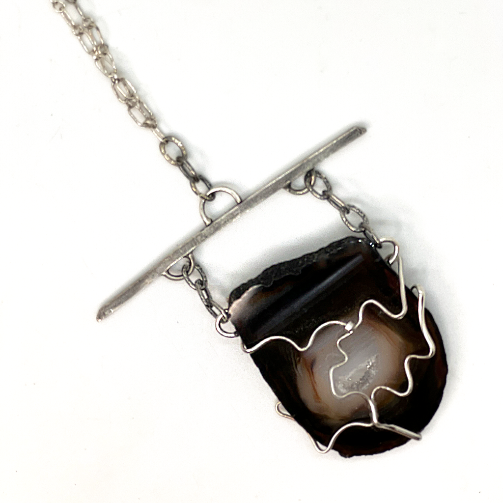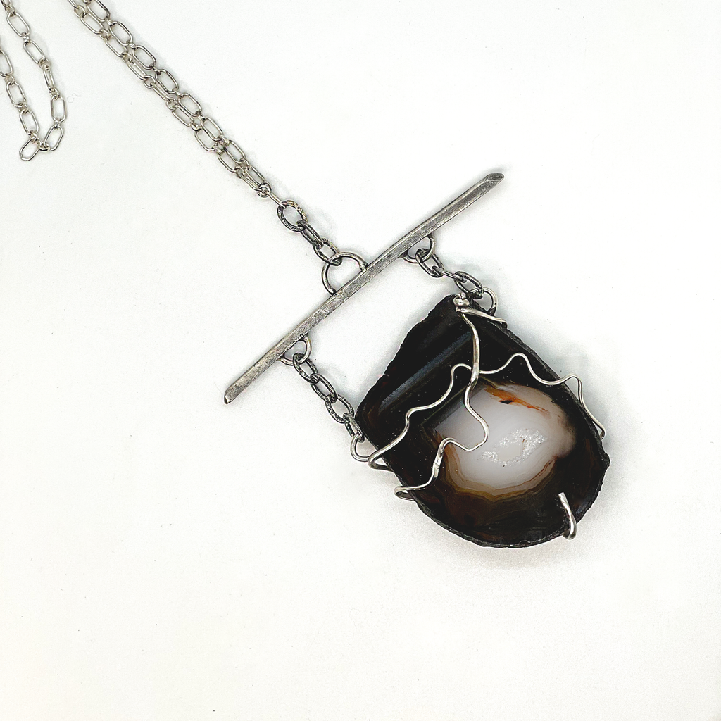 Brown with White Drusy Agate Slice Sterling Silver Long Chain Statement Pendant Necklace