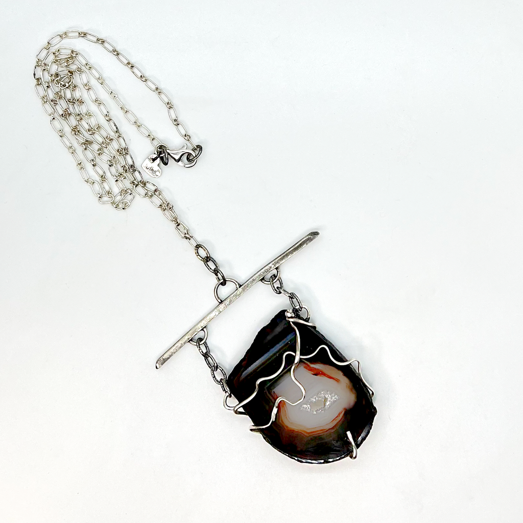 This beautiful slice of brown agate reminded me of the big tree in my back yard that all the birds flutter around. The drusy in the center gave me a sense of an old knot hole that had crystalized. I wanted to give the piece a sense of whimsy, like one of the bird houses we have that my mom loves to watch, hanging from the big tree branch, making all the birds happy. The sterling silver chain length is 24", the pendant is 3.5" w x 3.25" L. It has a sterling silver lobster clasp closure.