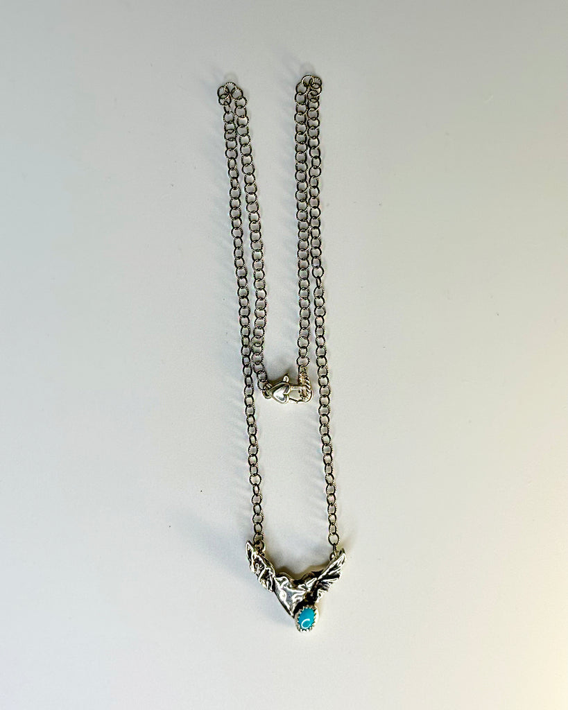This pendant features a beautiful Sleeping Beauty Turquoise stone, known for its calming and healing properties. The sterling silver frame is designed with a unique flying heart shape, adding a touch of elegance to any outfit. Perfect for those seeking a peaceful and stylish accessory.