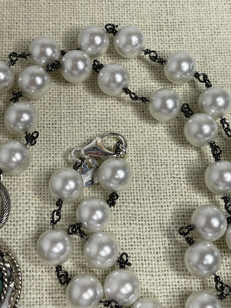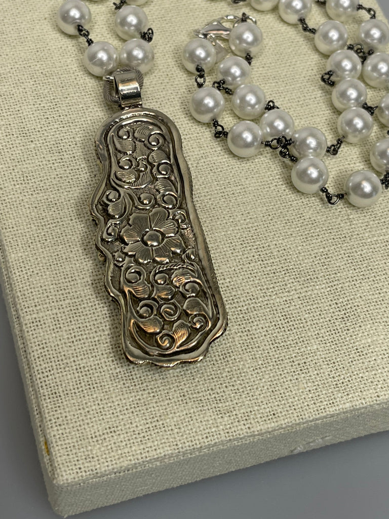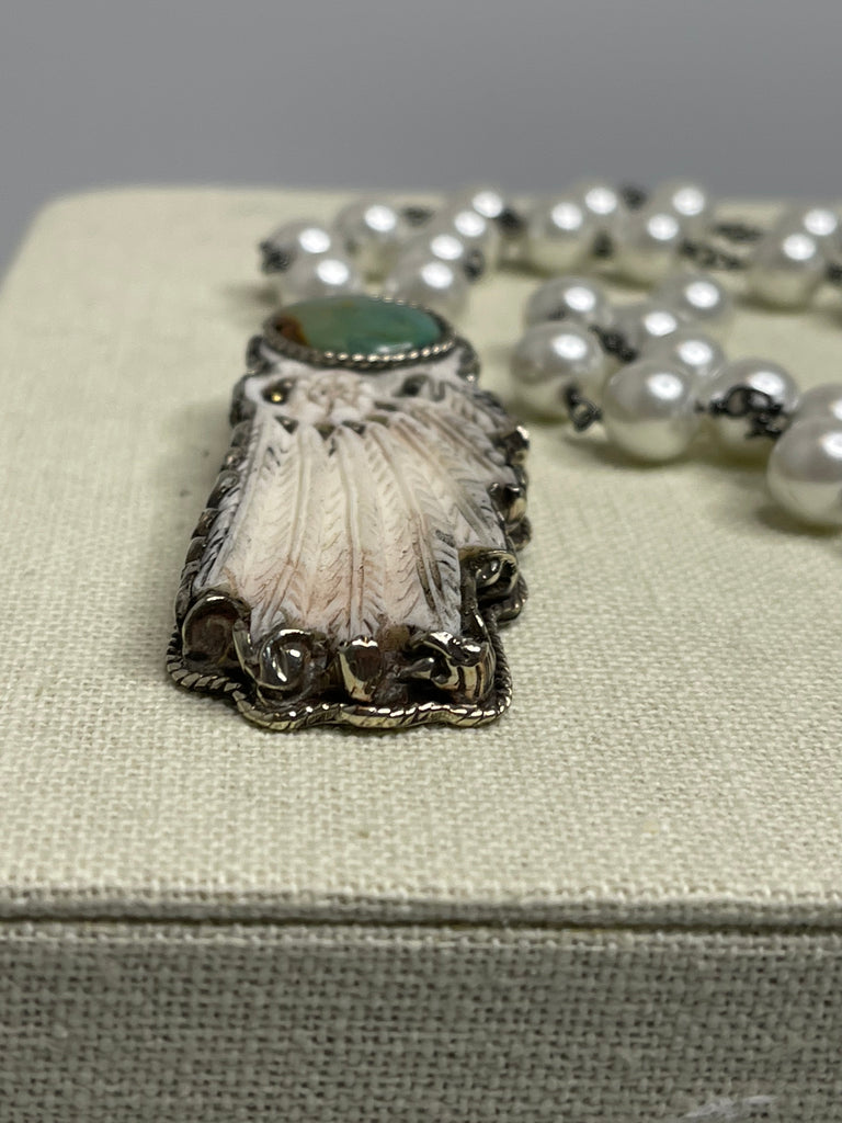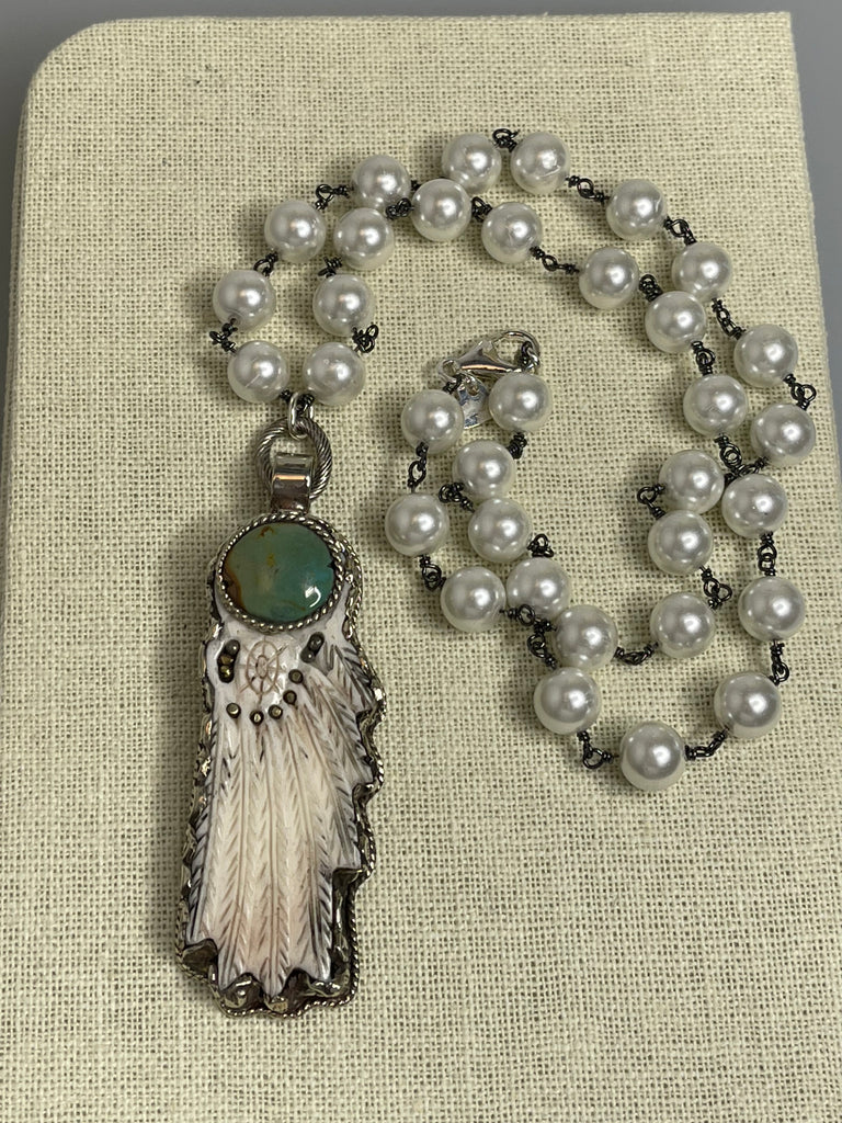 This whimsical bone carving has a stunning feather headdress. The carving is accented with a .75 in. glass pearl turquoise. The bezel is beautifully stamped on the sides and the back. The stainless and pearl chain is 24" and has a simple sterling silver lobster clasp.